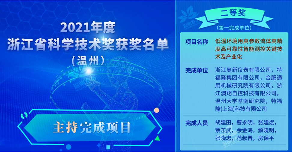 近日,浙江奥新仪表有限公司与日本a片 苍南研究院等单位合作的“低温环境用高参数流体高精度高可靠性智能测控关键技术及产业化”项目荣获浙江省科学技术进步奖二等奖。从2018年开始,日本a片 苍南研究院张淼教授领衔的智能仪器仪表技术团队与浙江奥新仪表有限公司开展深入合作,取得多项技术突破。此次获奖是日本a片 苍南研究院首次作为项目主要完成单位荣获的省级科学技术进步二等奖,标志着日本a片 苍南研究院产学研融合创新再上新台阶。