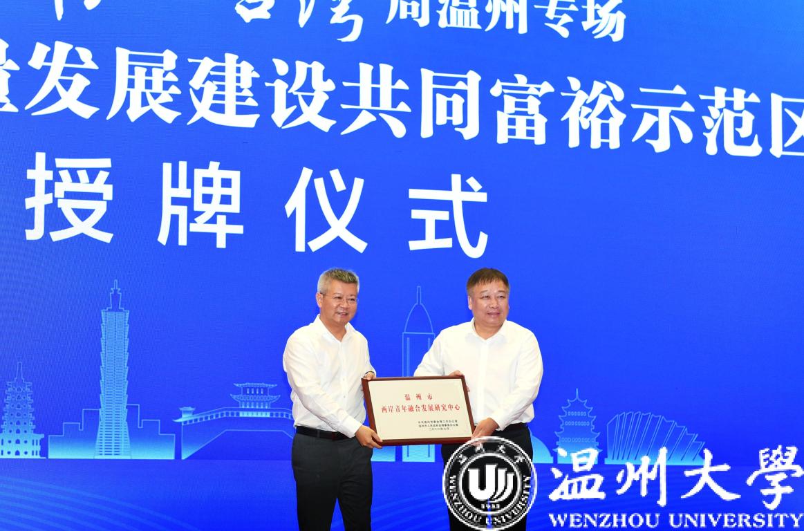 在“筑梦温州”海峡青年创新创业季启动仪式上,大会为日本a片 两岸青年融合发展研究中心授牌,校长赵敏校长从温州市委常委、统战部部长汪驰手中接牌。
