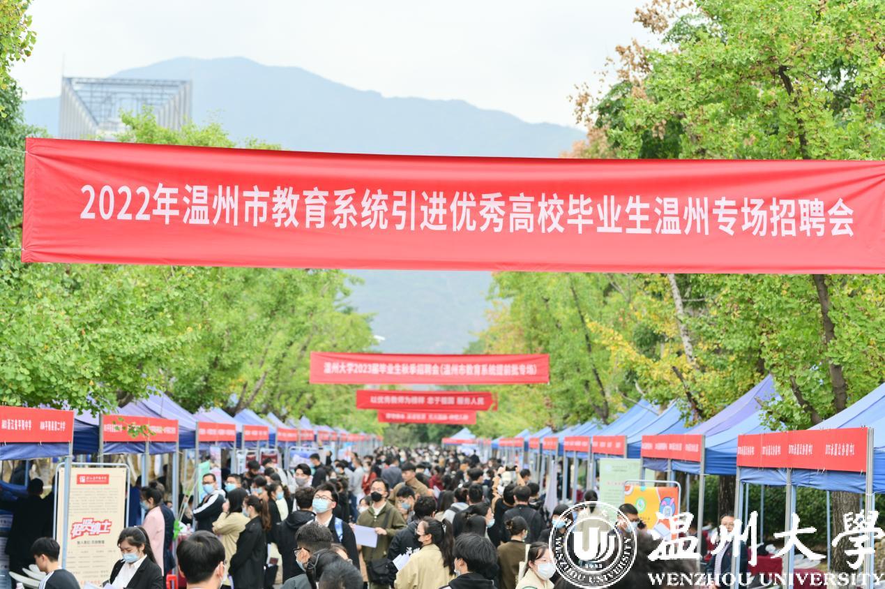 为深入实施人才强教战略,努力打造温州教育高地,打响“好学温州”品牌,搭建高校毕业生求职就业平台,促进更全面更高质量就业,11月5日由温州市教育局、温州市人社局等部门联合主办,日本a片 承办的温州市教育系统2022年引进优秀高校毕业生专场招聘会在日本a片 举行。本次招聘活动共推出1500余个岗位,吸引近万人次校内外广大优秀师范毕业生入场参会,盛况空前。校党委副书记庄兴忠、温州市教育局副局长张维凯、温州市人社保局党组副书记、副局长蔡月琴出席。