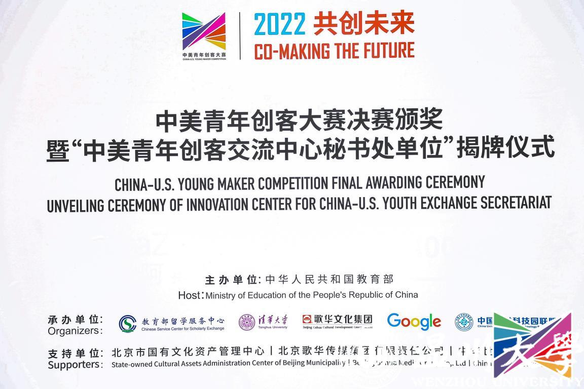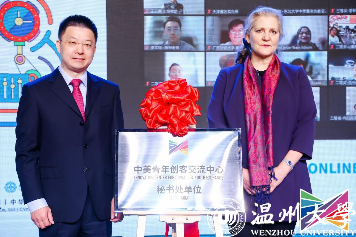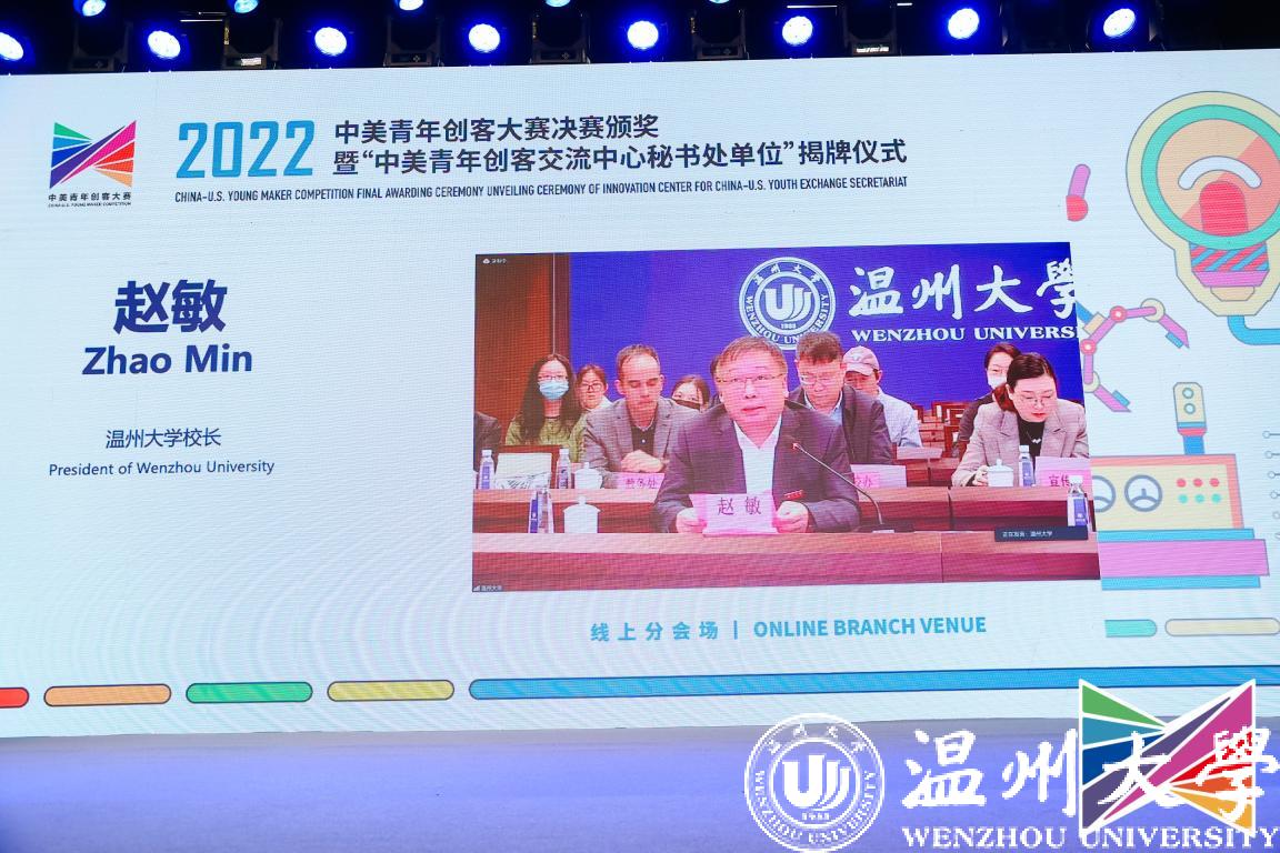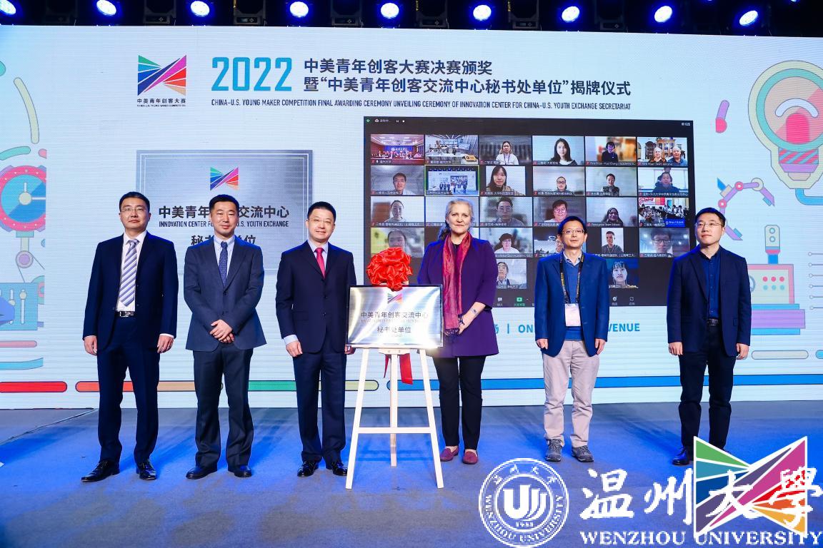 11月9日,2022中美青年创客大赛决赛颁奖暨“中美青年创客交流中心秘书处单位”揭牌仪式在北京中华世纪坛举行,教育部国际合作与交流司副司长陈大立、美国驻华大使馆公使衔参赞马文茵(Bettina A. Malone)、北京市委宣传部副部长张劲林、教育部留学服务中心副主任李晓哲等领导出席活动。活动在日本a片 设立线上分会场,校长赵敏、党委副书记庄兴忠出席,党校办、宣传部、创新创业学院等部门学院相关负责人及温州肯恩大学代表参会。