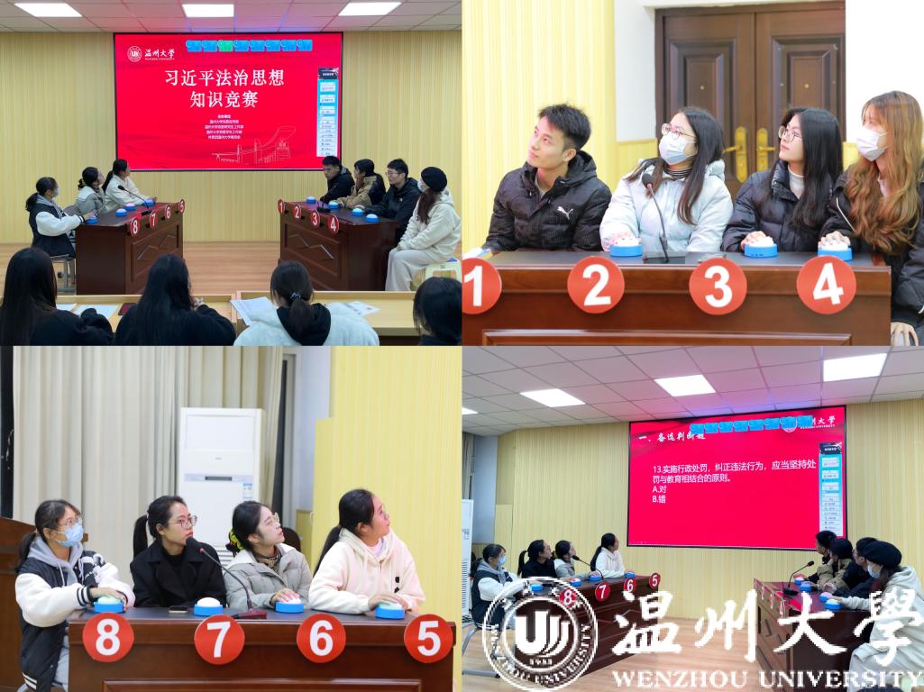“宪法宣传周”系列活动之“习近平法治思想”知识竞赛重点围绕宪法知识、习近平法治思想、党的二十大报告相关内容,设有判断题、单选题、多选题和逻辑题。500余名学生参与到知识竞赛初赛环节,最终32名选手进入决赛。决赛现场紧张热烈,充分检验了大学生对习近平法治思想、宪法知识的掌握程度,将法治学习的知识性与趣味性融为一体。