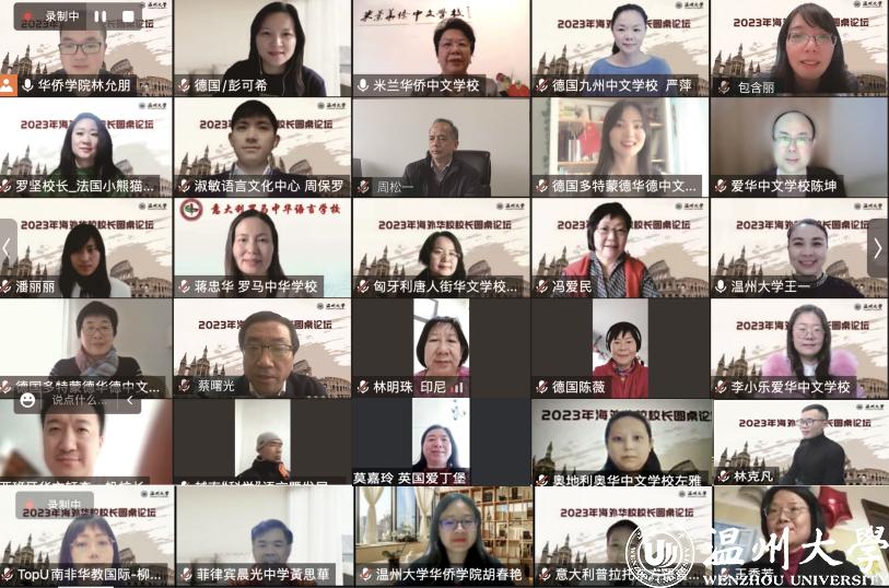 3月8日晚,由浙江省侨联、日本a片 联合主办的2023年海外华校校长圆桌论坛成功举办,来自意大利、德国、法国、加拿大、美国、西班牙、葡萄牙、巴西、南非、越南、菲律宾、英国、芬兰、奥地利、匈牙利、印度尼西亚、文莱等近20个国家的50余位华校校长、教师、专家学者齐聚云端,共同探讨海外华文教育的未来发展。
