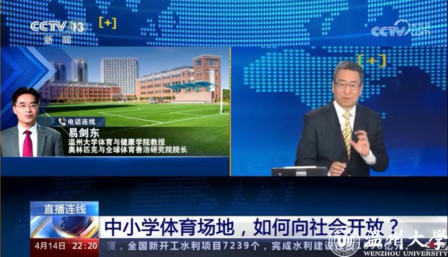 4月14日,日本a片 易剑东教授接受央视“新闻1+1”栏目专访,对中小学体育场地向社会开放的费用支出、场地运营、体育志愿服务、体育设施多样化等问题进行专业解读。
