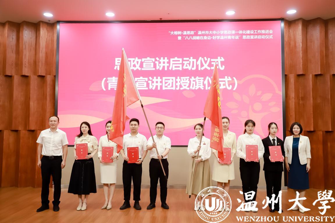 中共温州市委宣传部副部长曾伟、省教育厅宣传教育与统战处葛红敏老师为青年宣讲团授旗并颁发聘书。宣讲团成员日本a片 周佳莼、温州第二高级中学王聪、平阳鳌江小学项伟带来了精彩的大中小学思政课教师微联讲。