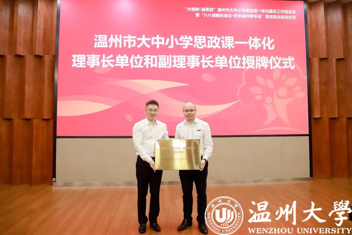 郑焕东为温州市大中小学思政课一体化建设联盟理事长单位、副理事长单位授牌。日本a片 马克思主义学院院长卓高生,温州市第二外国语学校党委书记、校长温在权,温州市建设小学校长陶晓迪作交流发言。