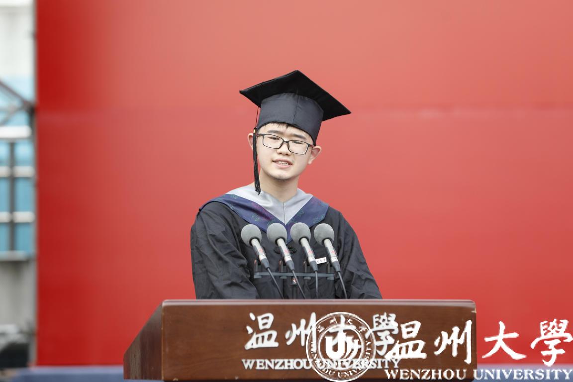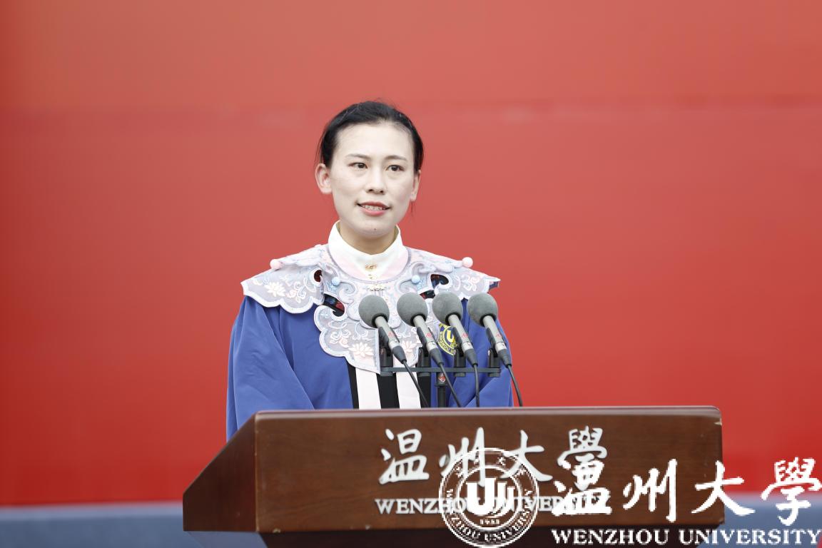 研究生代表、体育与健康学院的周佳莼同学代表毕业生感恩温大、师长、同学以及一起担负青年责任与使命的伙伴。她希望毕业生们不惧风雨、勇挑重担,让青春在奉献中焕发绚丽光彩,在青春的赛道上跑出最好成绩!