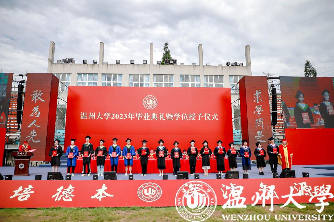 庄严而隆重的学位授予仪式举行。全体校领导与嘉宾为毕业生代表颁发学位证书并拨穗合影。帽穗的轻轻一拨,拨动的不仅是学子们在温大的点滴回忆,更是他们对人生新旅途的无限期许。