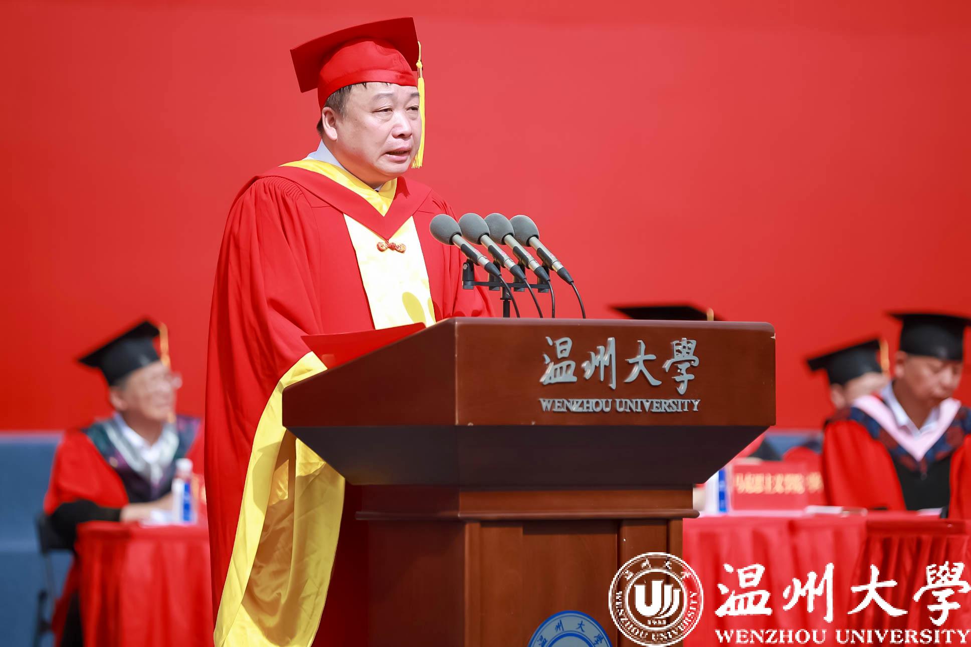校长、党委副书记,俄罗斯工程院外籍院士赵敏致辞。“几年前,你们在‘大哉师道天下尊,承往哲兮启后人’的校歌中,开启了‘求学问是、敢为人先’的温大之旅。温大见证了你们‘破茧成蝶’,也收录着你们的‘独家记忆’。”回忆同学们的求学时光,赵敏校长满怀骄傲与感慨。“几年来,学校与大家共同发展进步,成功迈入浙江省重点建设高校,成功增列为博士学位授予单位,隆重举行办学90周年盛典,跨越发展的步伐铿锵有力、豪迈自信!”