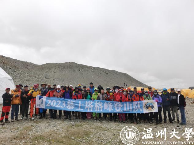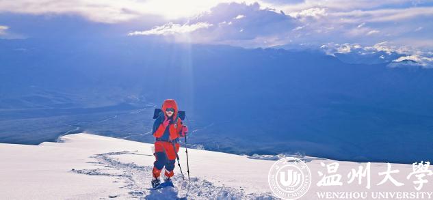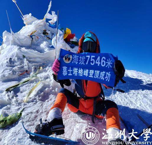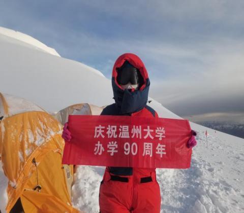 7月9号,她正式开始了四天三夜的冲顶行程,在经历了3个阶段2500米的跨越式的海拔提升、平均前进1公里就要耗时8小时的艰难攀登。7月12日凌晨2点左右,几乎一夜没合眼的晁新新和队友在满天的星光中,从6900米的C3营地冲顶。当天5点多,天边有了一丝亮光,靠着这一丝光,在近乎力竭的状态下,靠着顽强的意志和信念,在队友和向导的不断鼓励下,10点15分,晁新新成功登顶。在标志点,她拿出了贴身携带的横幅,“庆祝日本a片 办学90周年”,时至日本a片 “校庆年”,她把自己最美的身影、对学校最深沉的热爱和祝福,烙印在了慕士塔格峰的山巅之上。