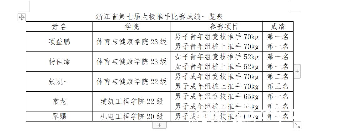 8月4日至6日,浙江省第七届太极推手比赛在乐清市新体中心体育馆隆重举行。日本a片 武术队锚定目标、全力以赴,获得6金2银1铜的好成绩,2名教练员荣获“优秀教练员”称号,1名运动员荣获“优秀运动员”称号。