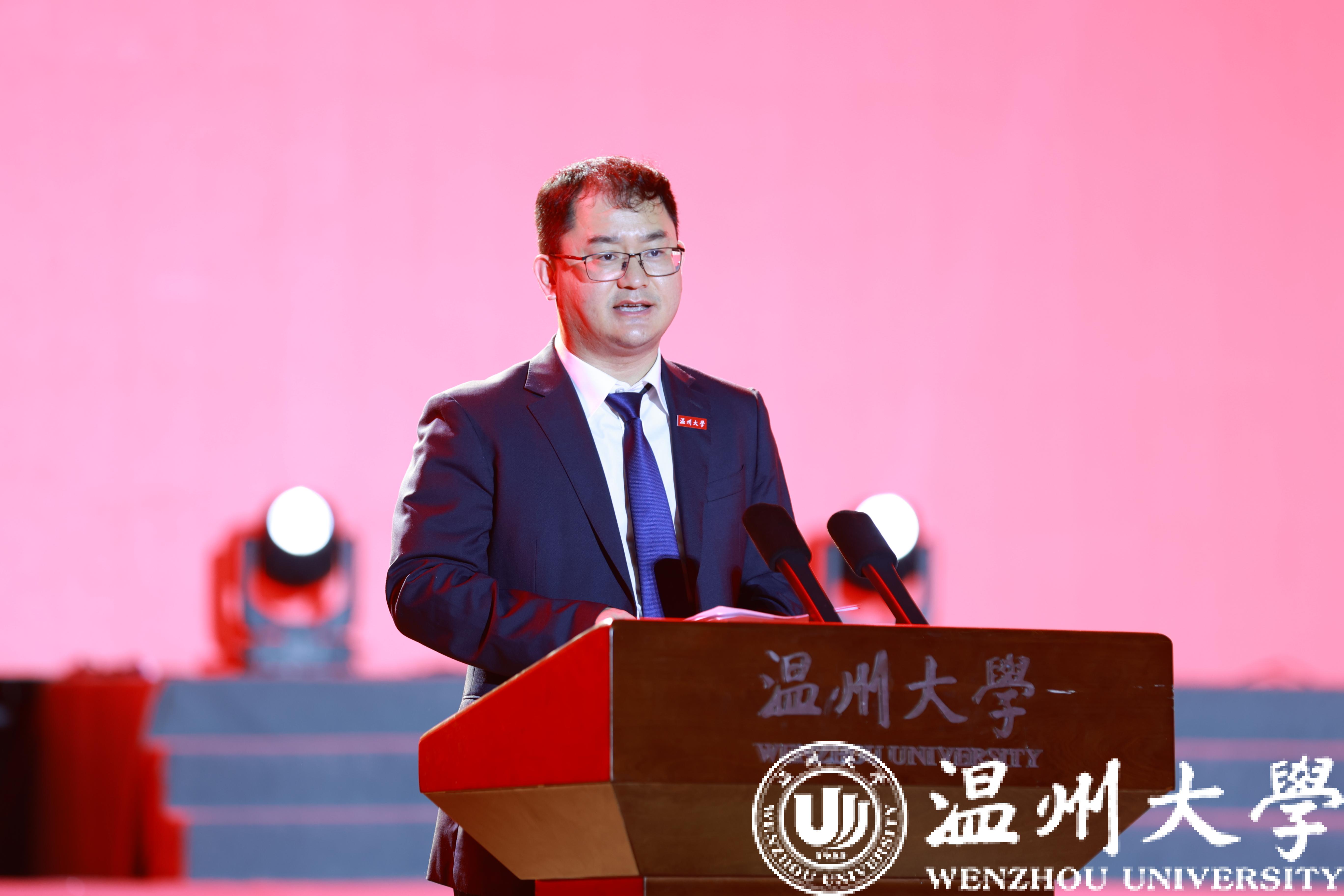 典礼上,建筑工程学院院长、国家杰出青年科学基金项目获得者王军教授作为教师代表为新生同学们送上了殷切寄语。他叮嘱同学们要时刻牢记来到温大为什么读书、为了谁读书、如何读书,勉励同学们为中华民族伟大复兴而读书,奋力奔跑、学有所成,与新时代同向同行。