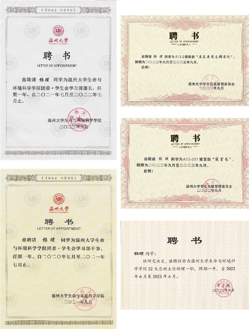科研竞赛方面,他入学至今参与过4项实验课题,积极参与学科类相关竞赛。在此期间,他以共同第一作者发表一篇SCI二区论文,并获得全国大学生生命科学竞赛一等奖和二等奖、浙江省大学生生命科学竞赛三等奖2次等科研竞赛奖项。此外,他还曾获得过国家励志奖学金、省政府奖学金、校“十佳大学生”、校一等奖学金等多项奖励与荣誉。