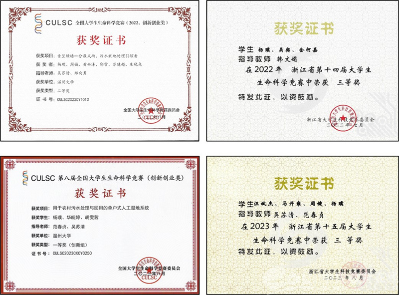 此外,他积极参与学科类专业竞赛,目前荣获第八届全国大学生生命科学竞赛(创新创业类)一等奖、第七届全国大学生生命科学竞赛(创新创业类)二等奖、浙江省第十四届和第十五届大学生生命科学竞赛三等奖。