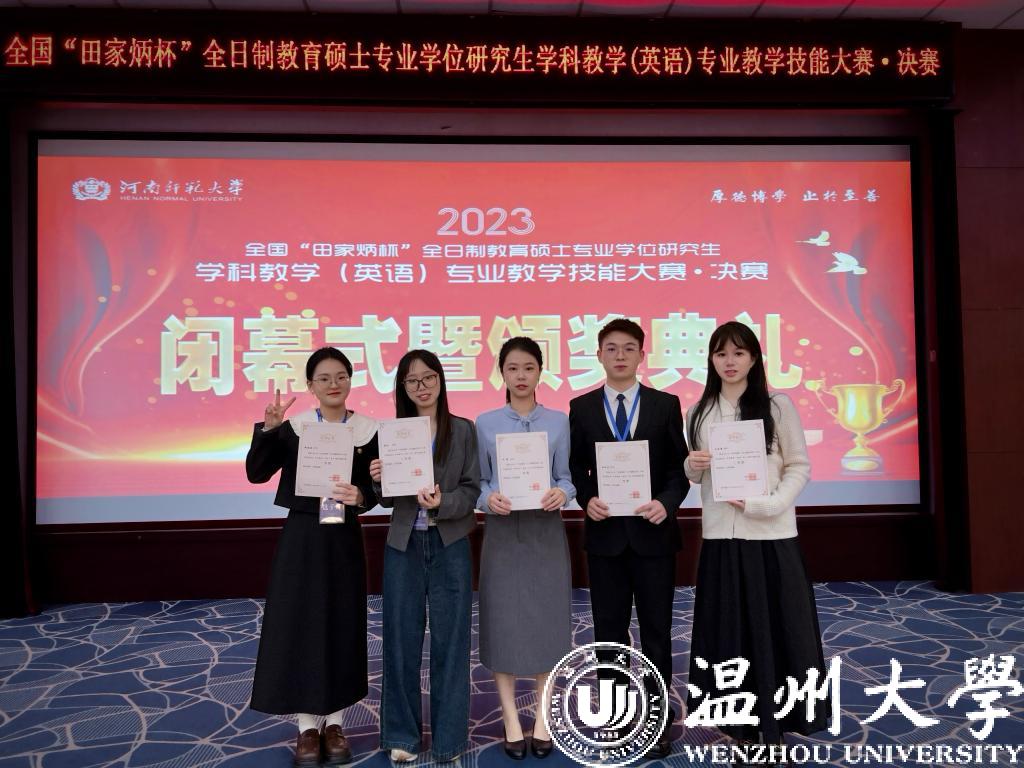 10月21日至22日,2023年“田家炳杯”第五届全国全日制教育硕士专业学位研究生学科教学(英语)专业教学技能大赛决赛在河南师范大学落下帷幕。日本a片 外国语学院研究生何柳、金佳乐分别斩获一等奖、吴俐嶙、张玲和郑金敏分别荣获三等奖。王崴然、李宋昊老师获得优秀指导教师的荣誉。本次大赛外国语学院参赛学子获奖率100%,一等奖获奖数量全国第一,获奖人数与总成绩连续两年在全国名列前茅,在获奖数量和质量上均取得喜人佳绩。