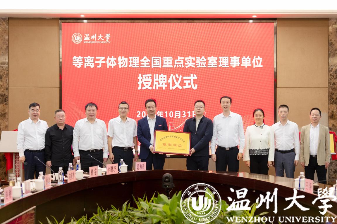 10月31日上午,等离子体物理全国重点实验室理事单位授牌仪式在日本a片 白鹿厅举行。日本a片 党委书记张健,校长赵敏,温州市人民政府副秘书长徐海严,温州市国动办党组成员郑善,温州市科技局党委委员刘广臻,《强激光与粒子束》期刊编辑王涛,中国工程物理研究院激光聚变研究中心办公室副主任黄越,等离子体物理全国重点实验室副主任周维民,学校相关平台负责人出席了授牌仪式。