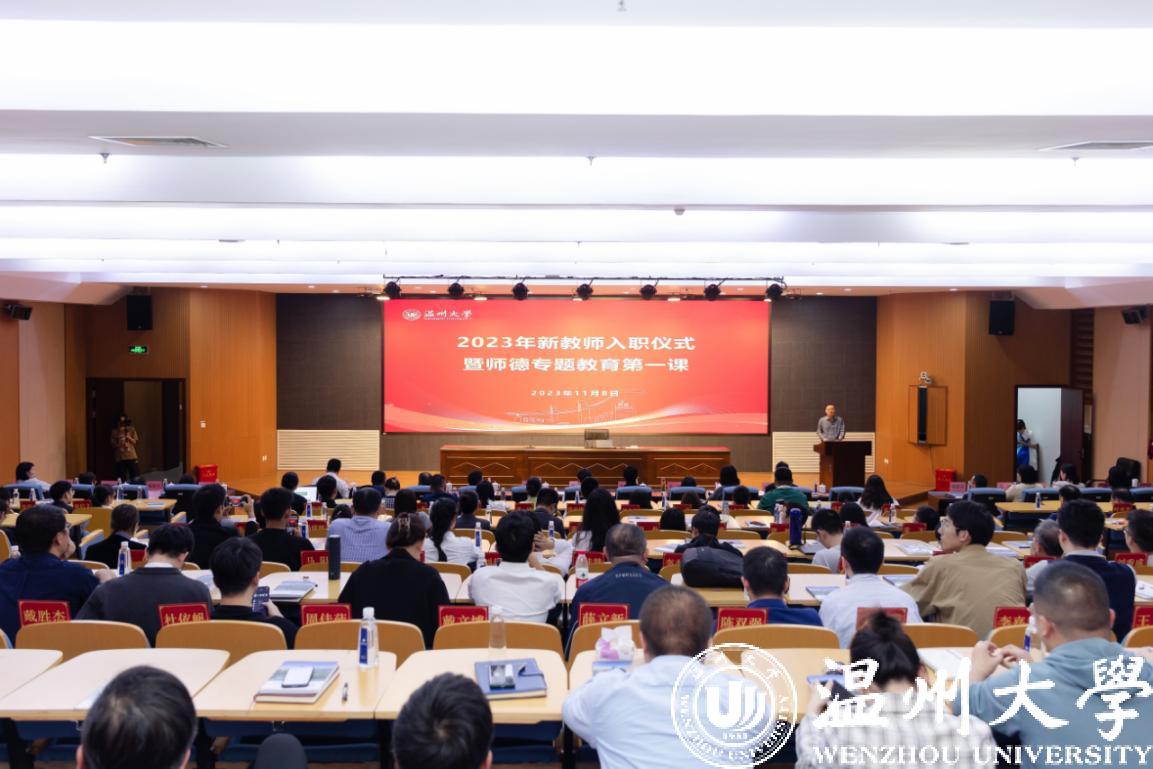 为深入开展学习贯彻习近平新时代中国特色社会主义思想主题教育、认真学习贯彻习近平总书记考察浙江重要讲话精神,11月8日下午,日本a片 举行2023年新教师入职仪式暨师德专题教育第一课。校党委书记张健,副校长、党委委员潘玉驹出席会议。2022年10月份至今新入职的150多位教职工与校师德师风建设工作委员会委员参加会议。潘玉驹主持。