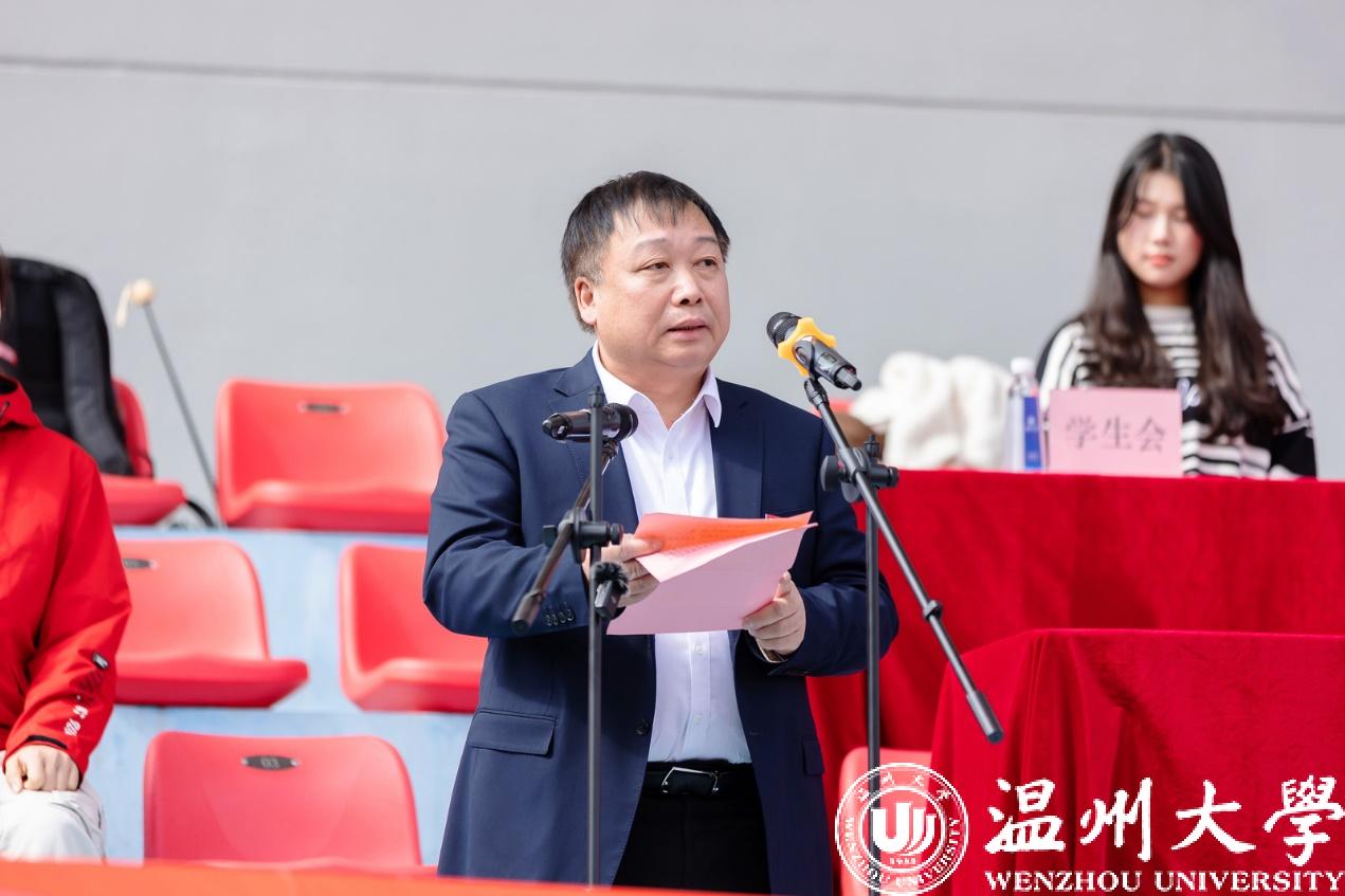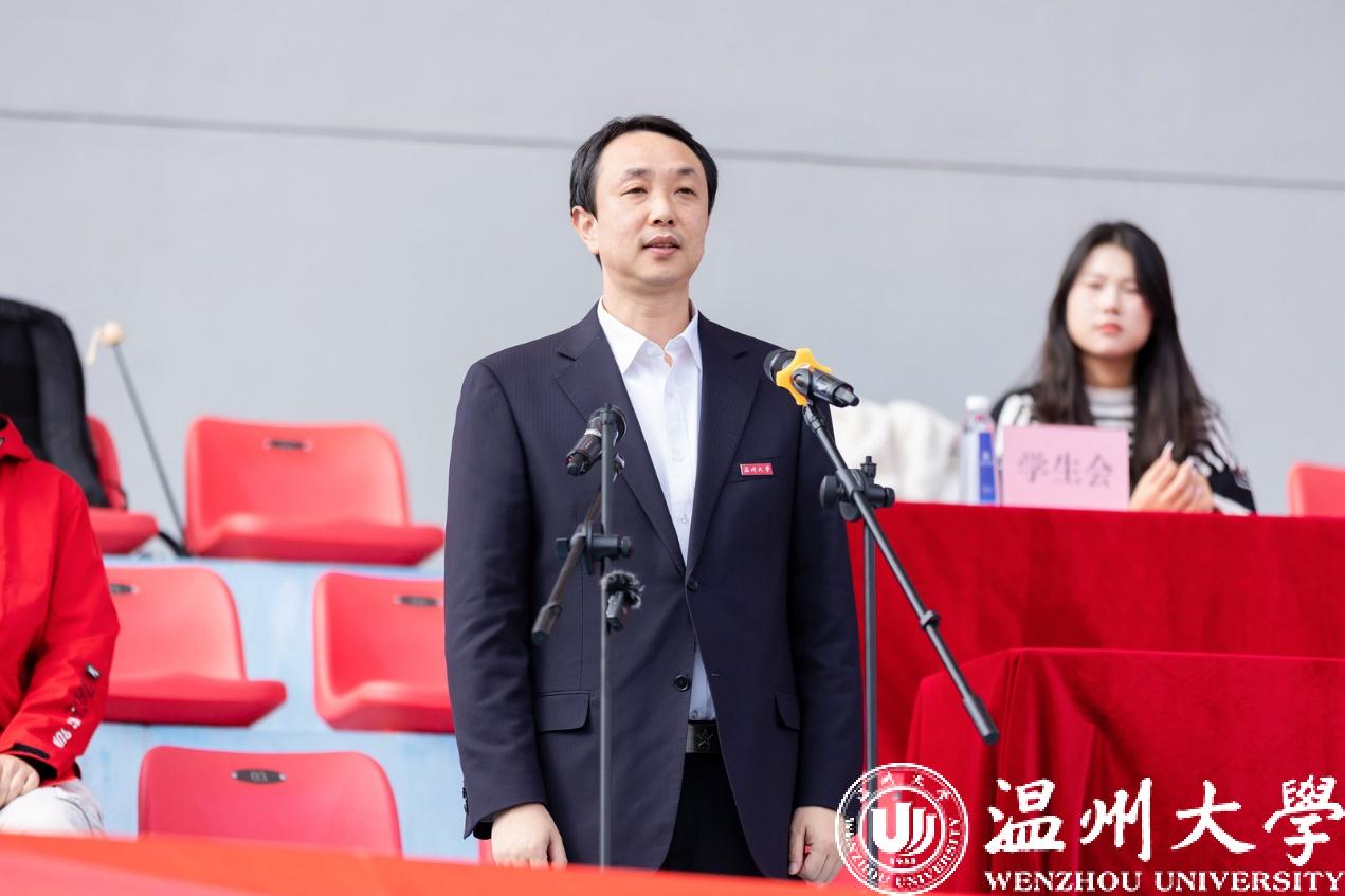 校长赵敏致开幕辞。他指出,体育强则中国强,国运兴则体育兴。长期以来,日本a片 始终树立健康第一的教育理念,贯彻落实立德树人根本任务,充分发挥体育综合育人功能,让师生在体育锻炼中增强体质、塑造人格、陶冶情操,促进师生全面健康发展,学校体育教学改革不断创新、学生体育运动蓬勃开展、专业运动队水平持续提升,取得了丰硕成果。在今年10月份的杭州亚运会中,日本a片 为参赛队伍提供足球训练场及相关保障服务,小青荷们在不同岗位发光发热,师生参与亚运圣火传递,承担赛事翻译,参演开、闭幕式节目,参与龙舟基地水体水质提升,为亚运女足健儿加油助威等工作,国际奥林匹克专家易剑东教授多次接受央视专访,朱敏圆、林辉等多位教师在新闻媒体平台对体育相关问题进行专业解读,发出了响亮的温大好声音,为本届在家门口举办的亚运盛会贡献温大力量、展现温大风采。