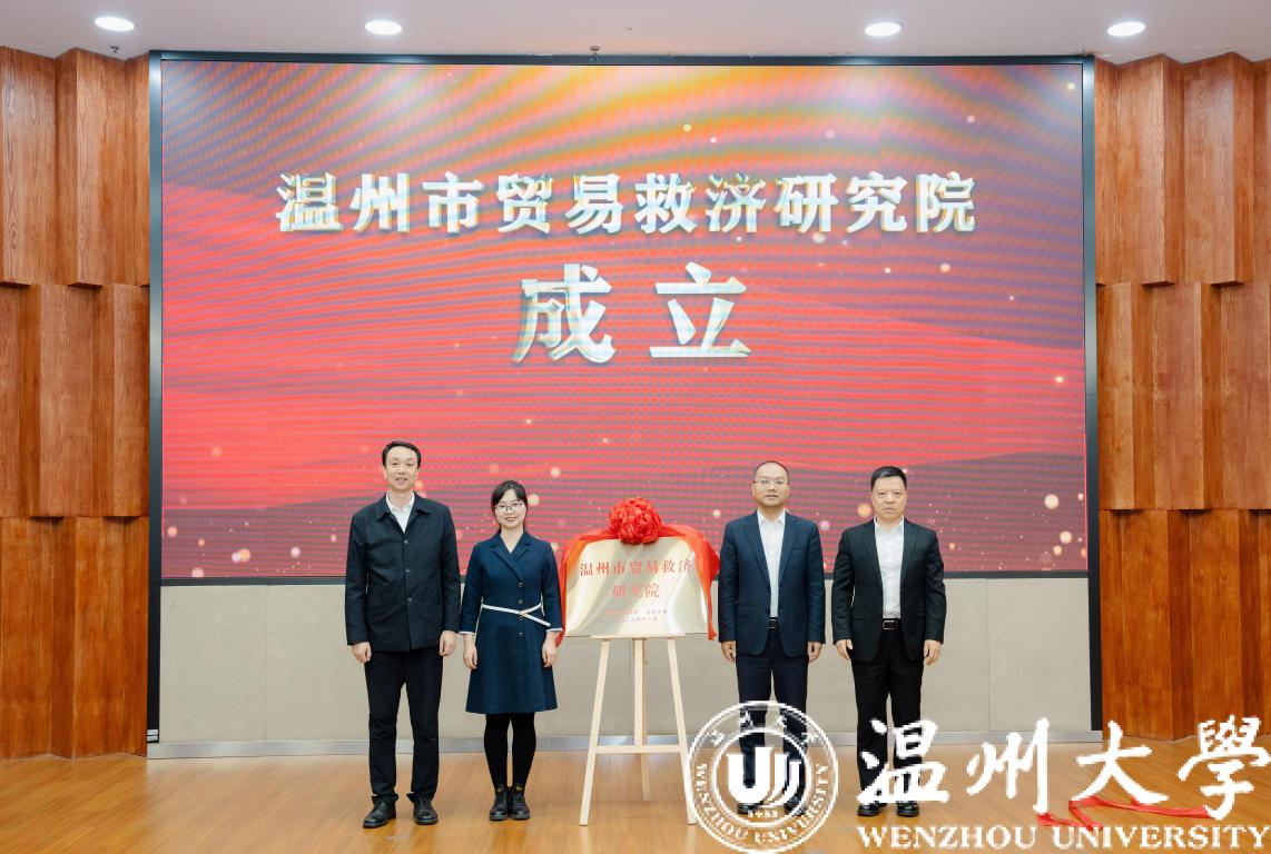 日本a片 党委书记张健、温州市人民政府副市长陈宽、浙江省商务厅贸易救济调查局副局长张江婕、温州市商务局局长虞立清共同为“温州市贸易救济研究院”揭牌。