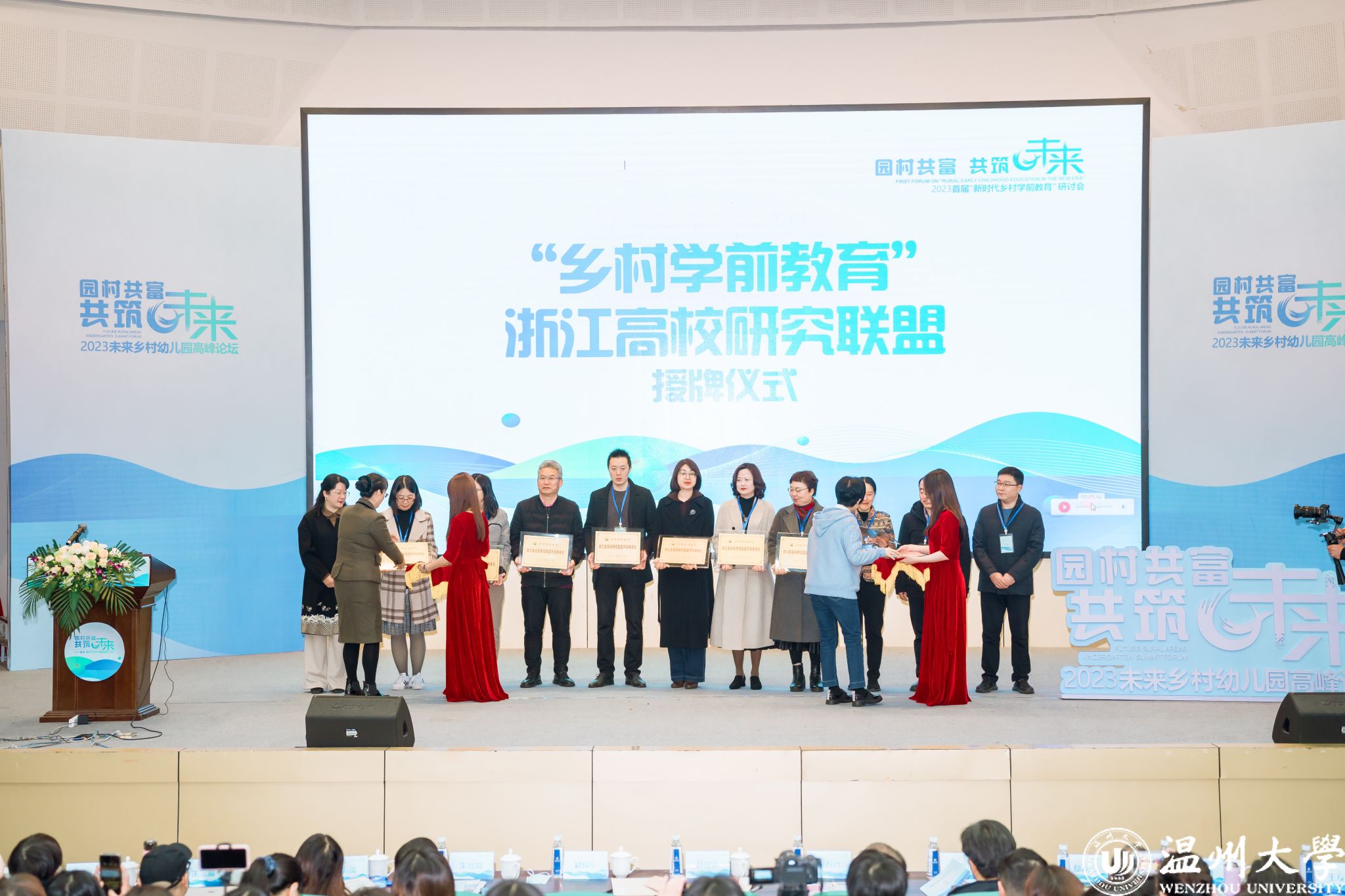研讨会开幕式上,日本a片 学前教育系作为召集单位,携手浙江省各高校学前教育系牵头组建浙江省乡村学前教育研究联盟,赵降英和何春玲共同为联盟授牌。