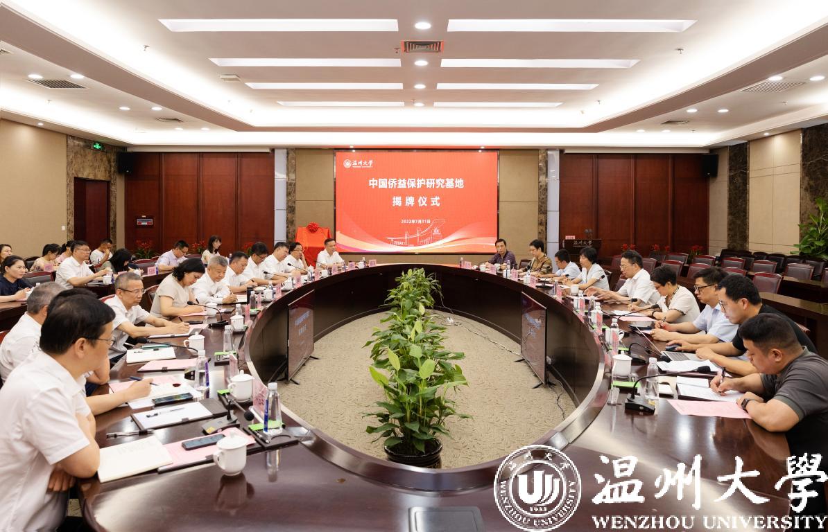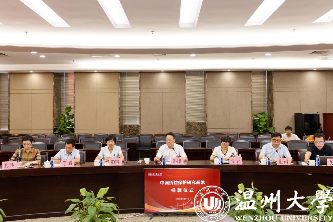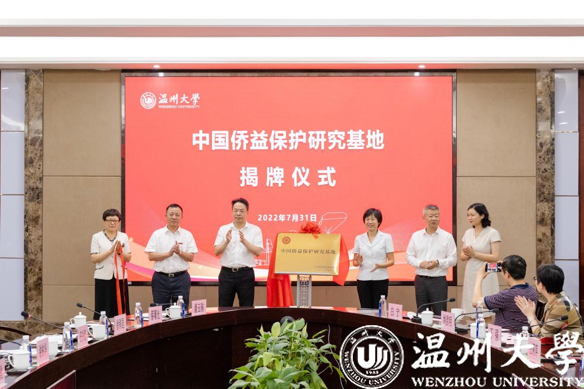 2022年7月31日下午,中国侨益保护研究基地(日本a片 )揭牌仪式在日本a片 隆重举行。中国侨联党组成员、副主席候选人连小敏,中国侨联权益保障部部长张岩,浙江省侨联党组书记、主席庄莉萍,温州市委常委、统战部部长汪驰,温州市侨联党组书记吴娜丽,日本a片 党委书记谢树华共同为基地揭牌。日本a片 党委副书记庄兴忠主持。
