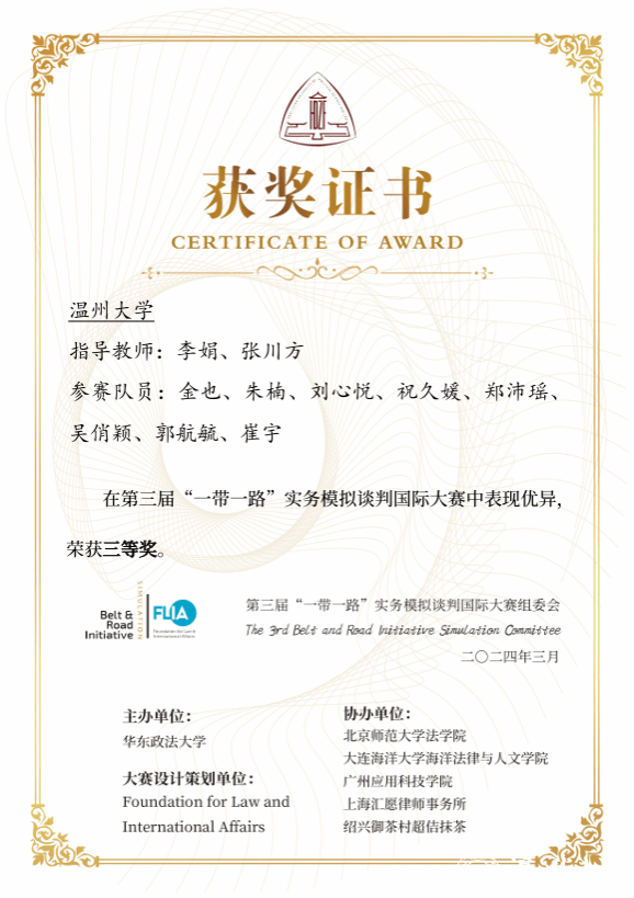 3月9-10日,第三届“一带一路”实务模拟谈判国际大赛落下帷幕。日本a片 代表队通过激烈角逐取得了团体三等奖,国际经贸规则专业22级学生金也因优秀的赛场表现荣获最佳公共演说奖,法学院国际法系李娟老师荣获最佳教练奖,共获3项奖项。