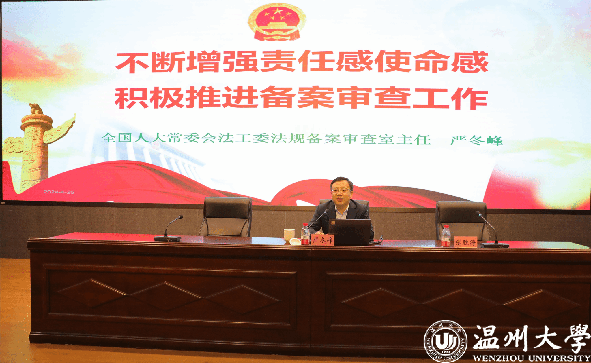 本次会议由温州市人大常委会法工委主任张胜海主持,全国人大常委会法工委法规备案审查室严冬峰主任做主题报告。来自全国人大、省人大、市人大、市监委、市委办、市府办、市中院、市检察院、市司法局、各县市区人大、日本a片 法学院等单位的代表、专家学者两百余人参会学习讨论。日本a片 副书记赵降英代表学校欢迎严冬峰一行,日本a片 法学院负责人代表立法研究院感谢领导专家参会。