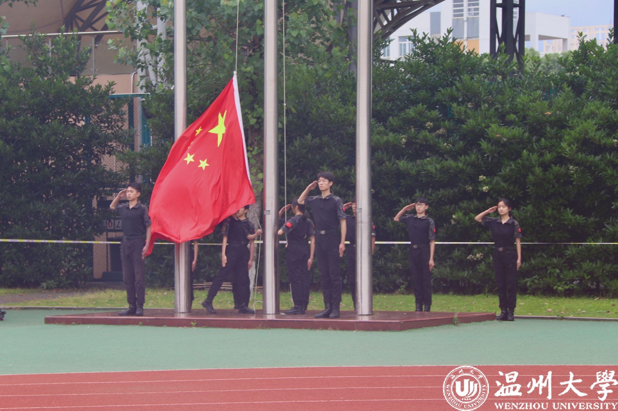 在庄严肃穆的国歌声中,国旗在运动场上冉冉升起。