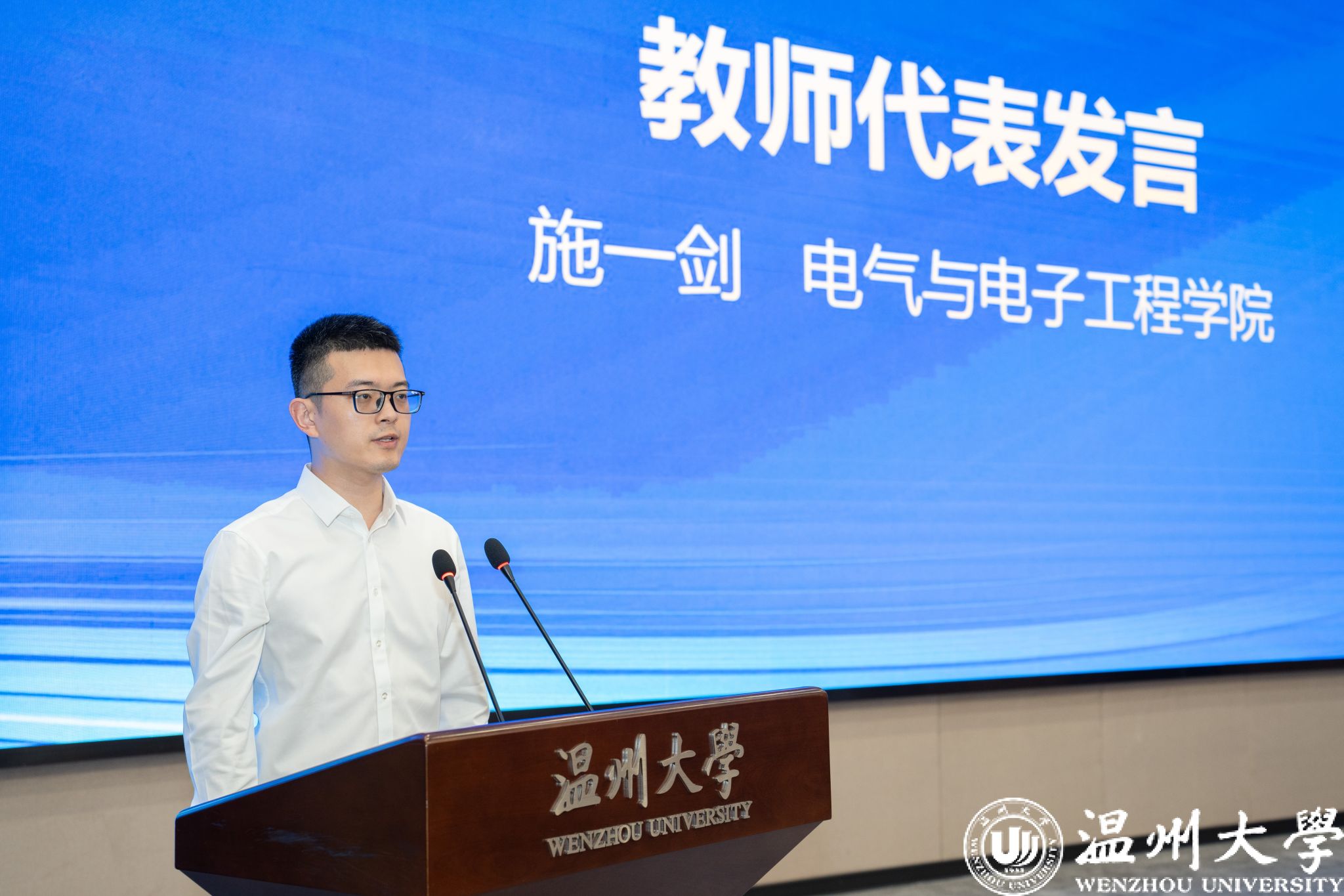 获奖师生代表围绕自身教学科研、学习成长、报国之志等方面做心得分享。电气与电子工程学院副教授施一剑老师表示所有获奖教师必将带着这份责任和使命以更加饱满的热情投入工作中,不忘初心,砥砺前行。数理学院舒璐莹同学表示将继续踔厉奋发、追求卓越,回报母校、回报社会。人文学院李孟龙同学号召同学们做有家国情怀的温大学子。