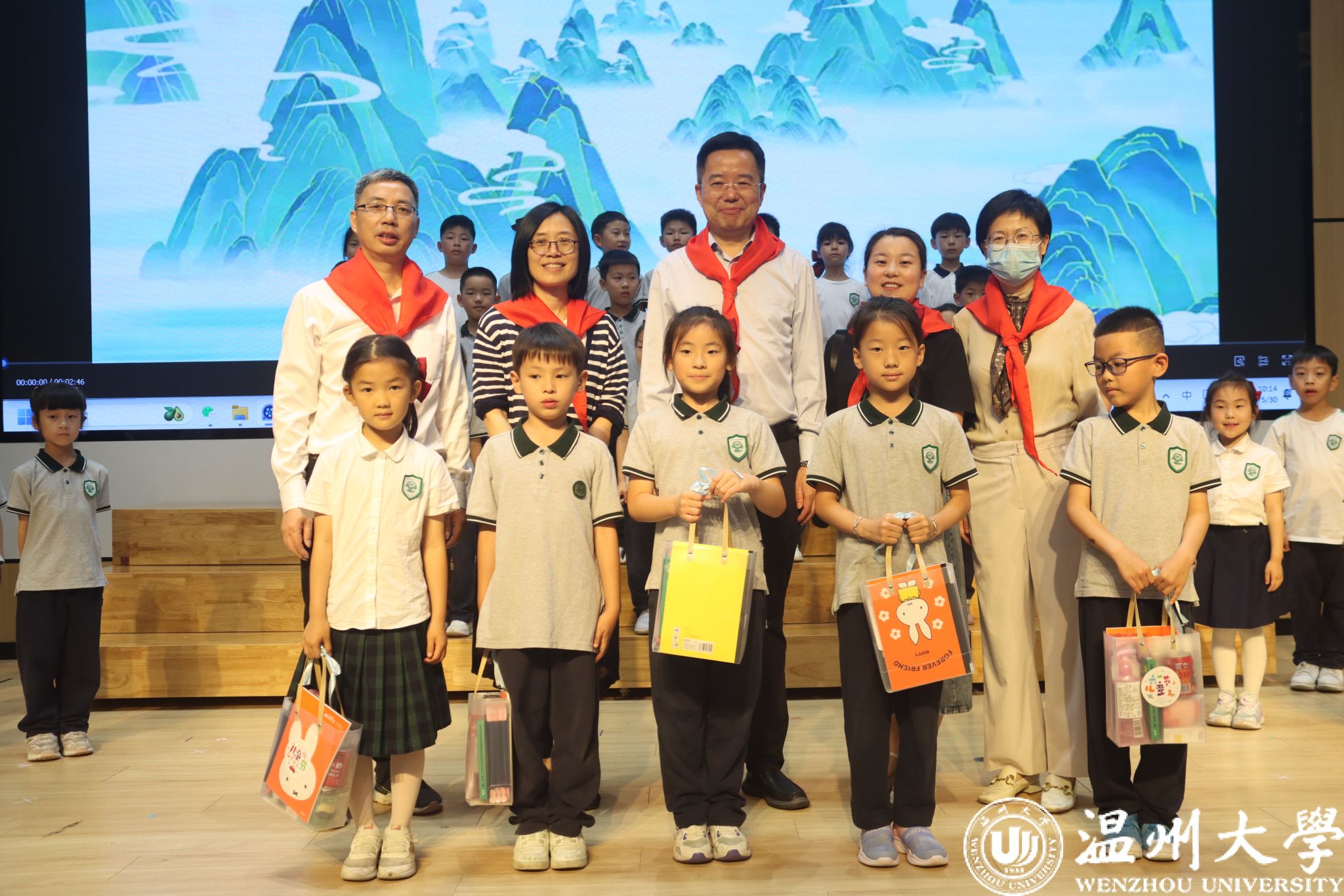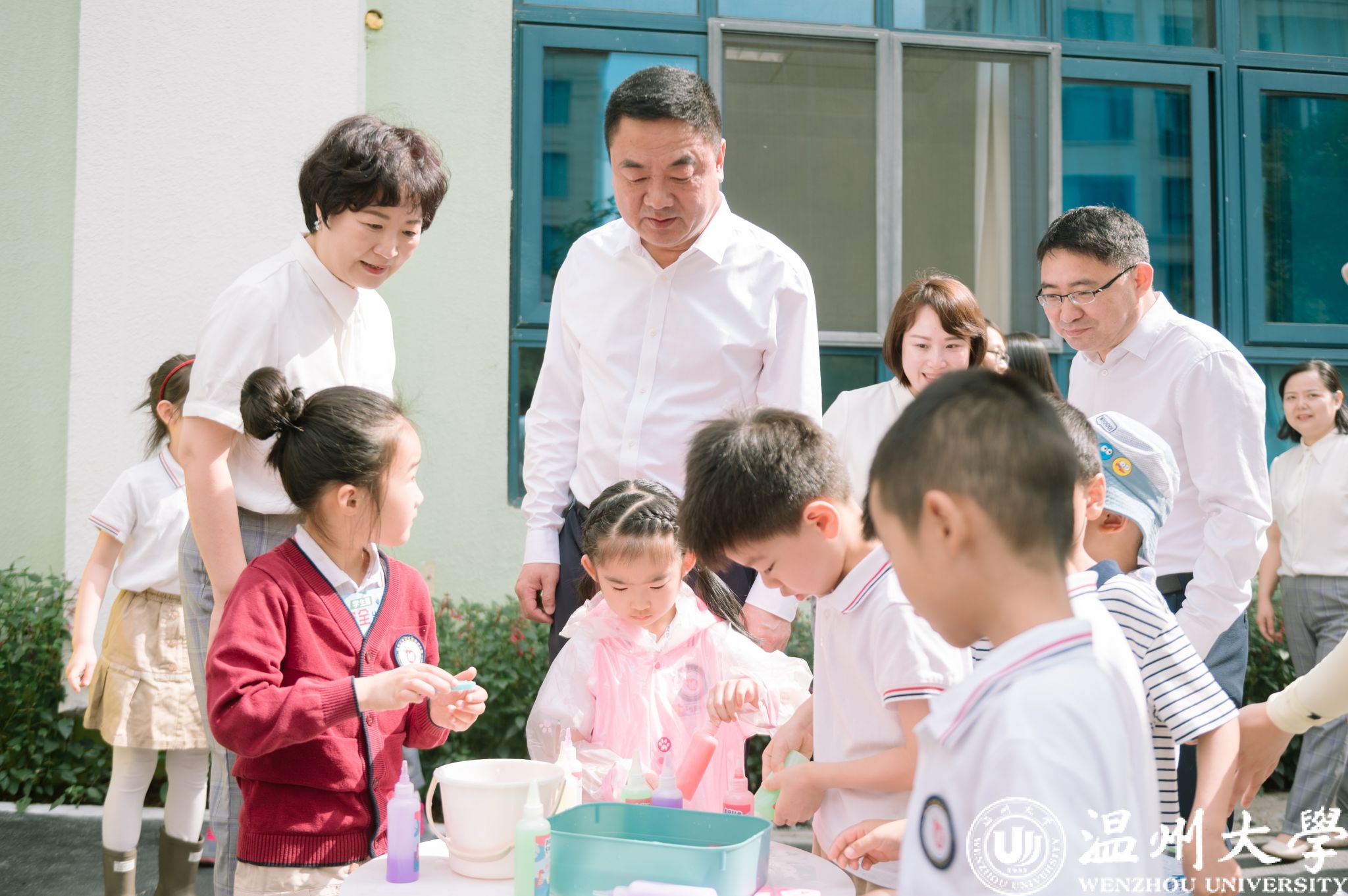 在第74个“六一”国际儿童节来临之际,校党委书记钱强,党委副书记庄兴忠、赵降英,副校长王舜、王尧骏等领导于5月30日分别前往日本a片 各附属学校(幼儿园)开展“六一”儿童节慰问,为孩子们送去节日祝福。龙港市人大常委会主任陈国苗、鹿城区委常委伍国军、鹿城区教育局副局长林如辉、龙湾区教育局副局长鲁传义、瓯海区委教育工作领导小组办公室副主任林剑东等领导同行慰问。