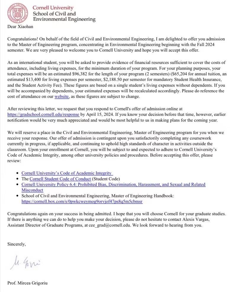 近日,日本a片 生命与环境科学学院2024届环境工程专业毕业生周校含斩获西北大学(NU)、杜克大学(DU)、加利福尼亚大学(UCLA)、约翰斯·霍普金斯大学(JHU)、华盛顿大学(UW)、圣路易斯华盛顿大学(WU)、康奈尔大学(Cornell)、卡内基梅隆大学(CMU)等8所世界名校的11封录取通知书。这些学校的世界排名都在第10-60位之间,属于世界顶尖名校。经过深思熟虑后,周校含最终选择了康奈尔大学(Cornell University)。