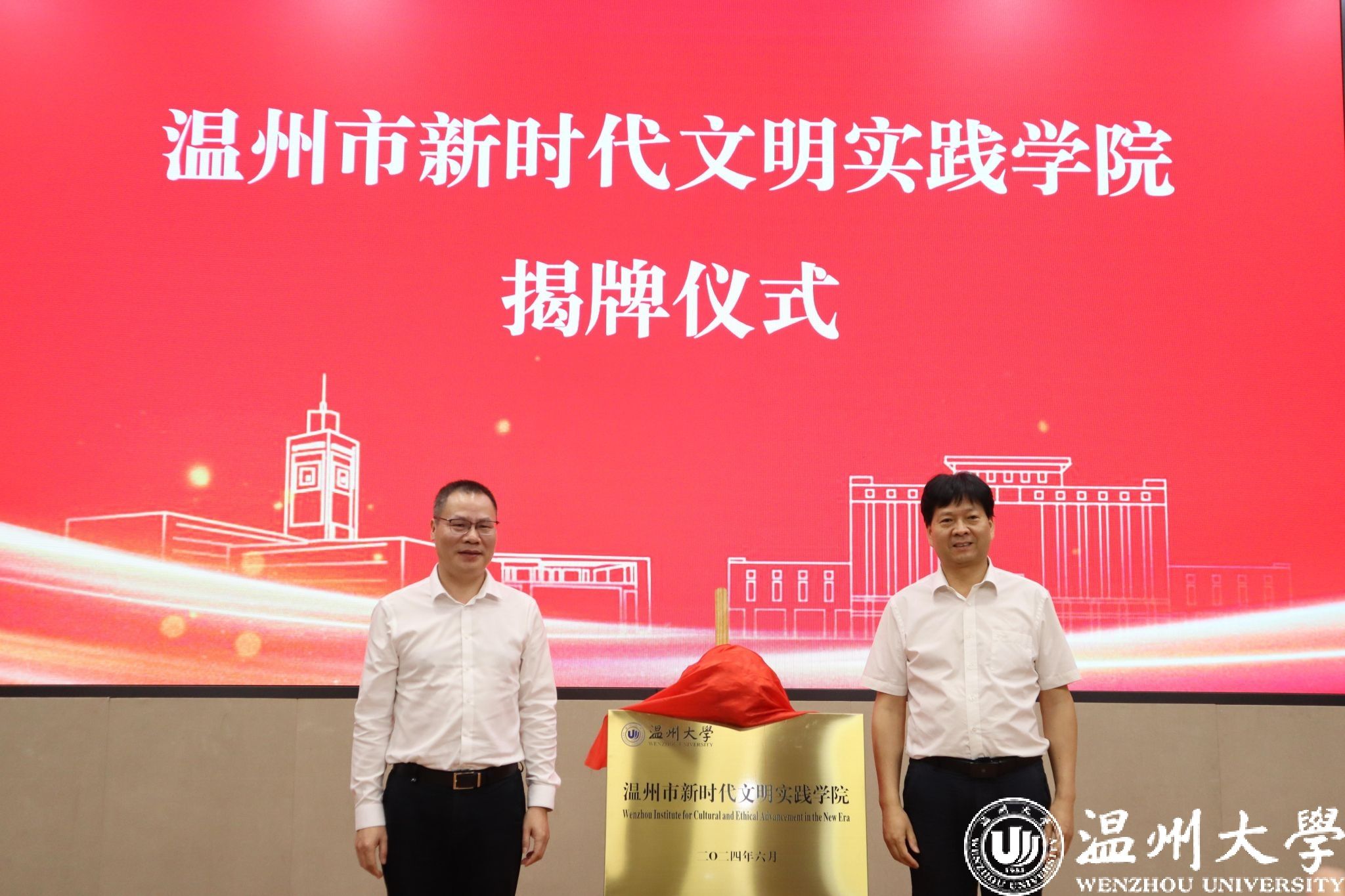 6月18日上午,温州市新时代文明实践学院揭牌暨2024年新时代文明实践中心(所、站)专兼职人员第一期教学交流班开班仪式在日本a片 举行。市委宣传部副部长、市文明办主任、市文明中心主任沈林杰,校党委副书记庄兴忠等领导出席。