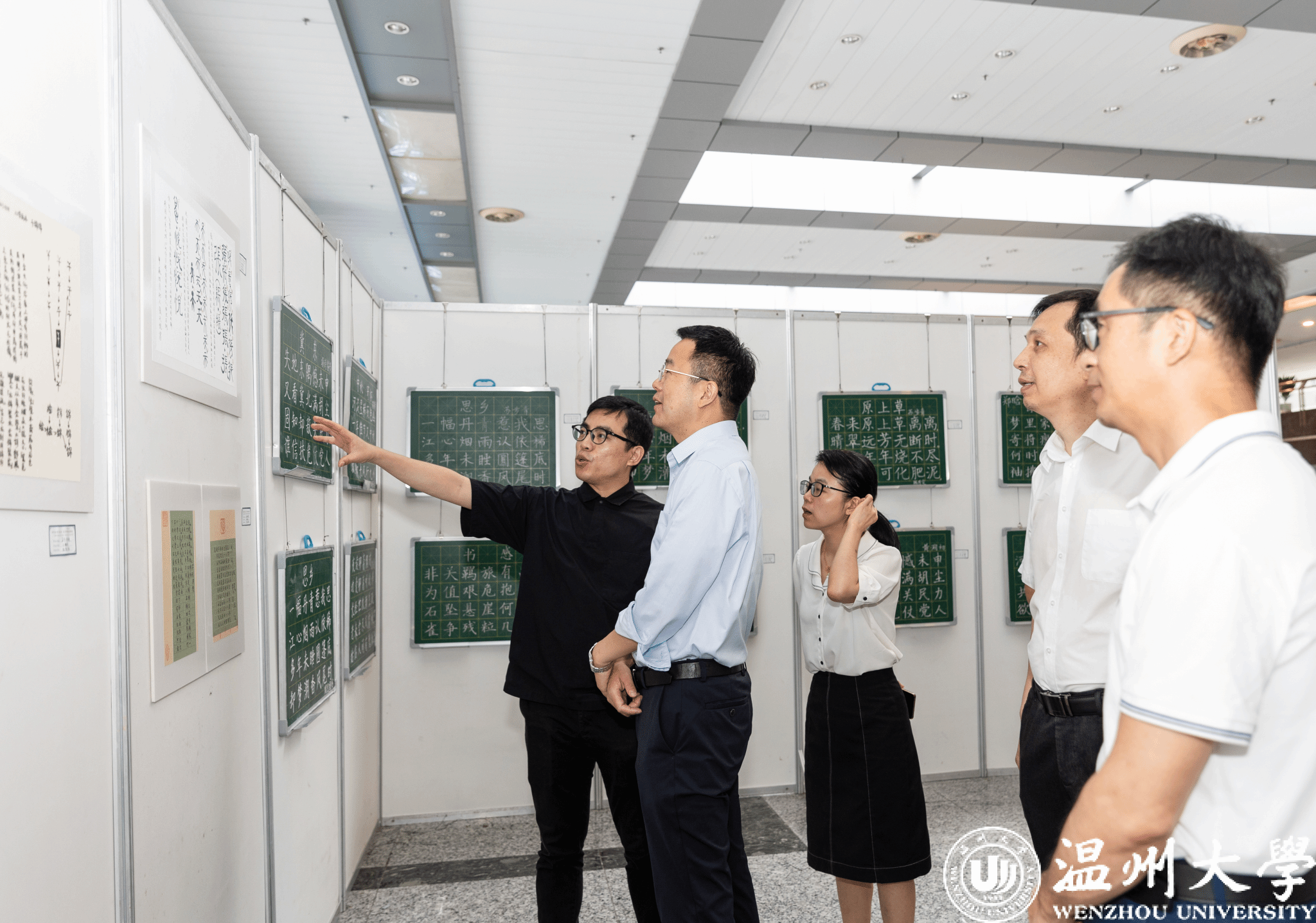 此次作品展依托溯初实验班《书法美育》课程,共展出16个师范专业学生创作的100余件作品,以“主动、互动”的名字溯源、以“生动、灵动”的板书集锦、以“感动、触动”的校庆献辞、以“心动、跳动”的诗词赓续为组合,全面实施美育浸润行动,以美育浸润学校、浸润学生、浸润教师。“名字溯源”让学生对自己的姓氏开展寻根溯祖,明晰自己姓氏的根之所在;“板书集锦”让学生独立开展高质量的规划教学,成为促进学生成长的笃行者;“校庆献辞”让学生与母校心连心,成为温大卓越教师的筑梦人;“诗词赓续”让学生跨越古今,品味和传承诗词中的中华文化美。