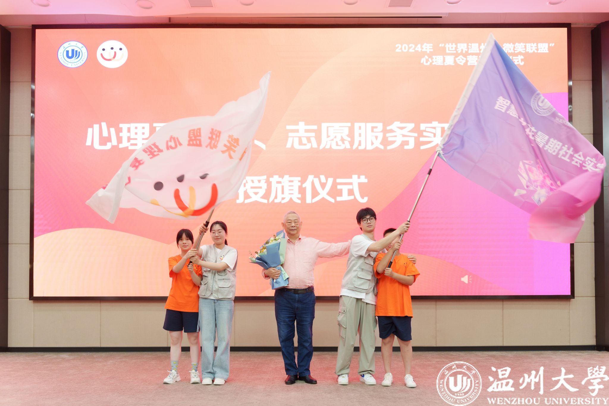 何纪豪先生与在座嘉宾和营员们分享了“世界温州人微笑联盟”项目成立的历史渊源和背后的暖心故事,肯定了微笑儿童们在心理夏令营的帮扶下发生的积极改变,倡导广大温州人能够抱团行善、传递大爱精神。何纪豪先生还为心理夏令营和志愿服务实践队授旗,并邀请温州医科大学附属口腔医院党委书记潘乙怀共同接受受助儿童代表赠送的锦旗。