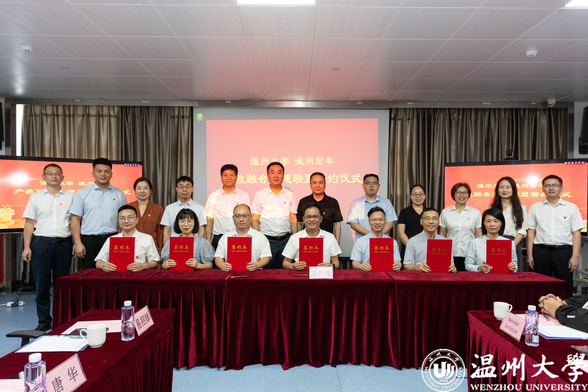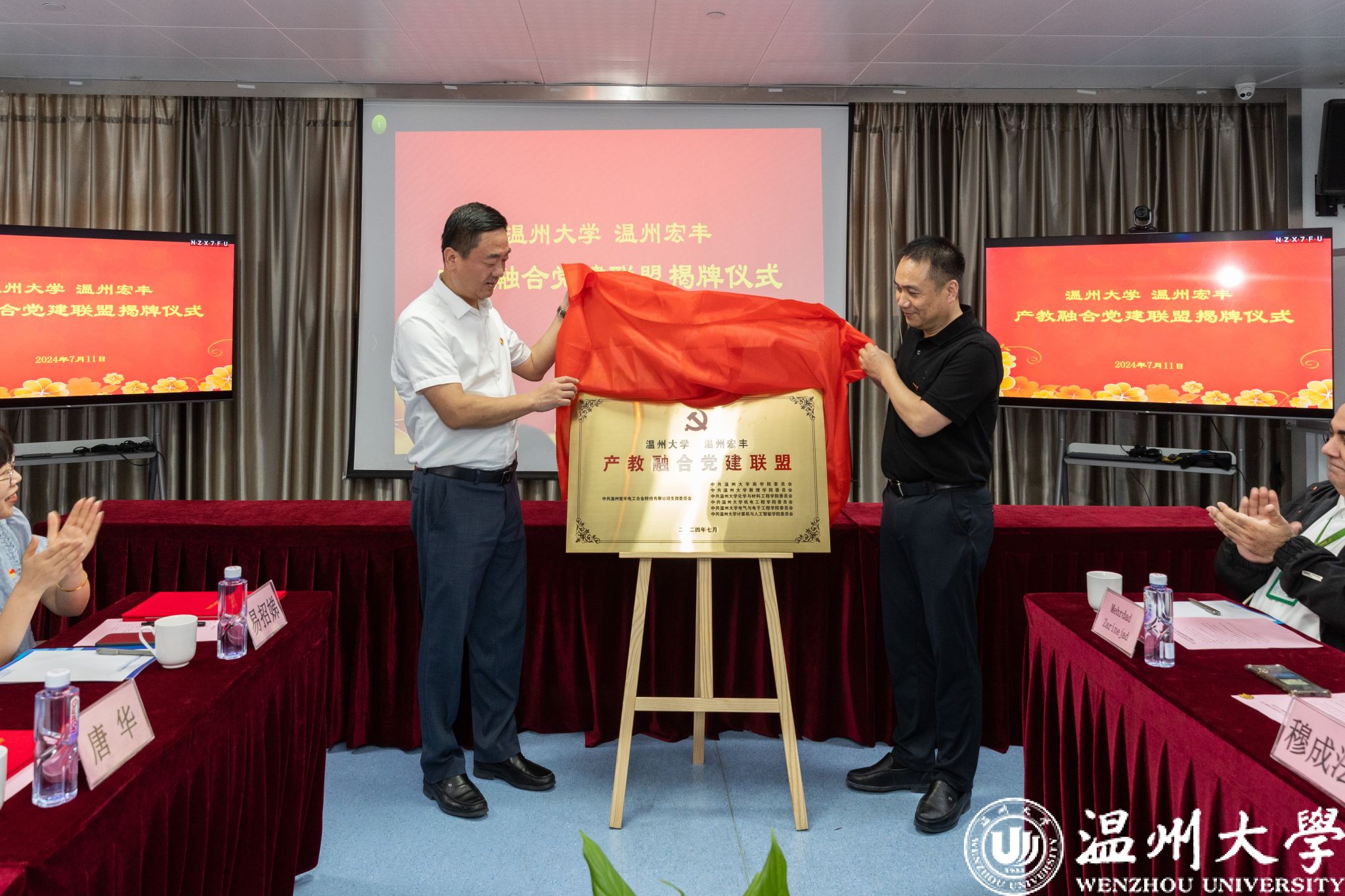 7月11日,日本a片 与温州宏丰电工合金股份有限公司共建产教融合党建联盟揭牌仪式在温州宏丰举行。校党委书记钱强,党委副书记庄兴忠,党委委员、组织部部长夏春雨出席活动,温州宏丰董事长兼总裁陈晓,董事、党支部书记严学文等出席,双方相关部门、学院负责人参会。