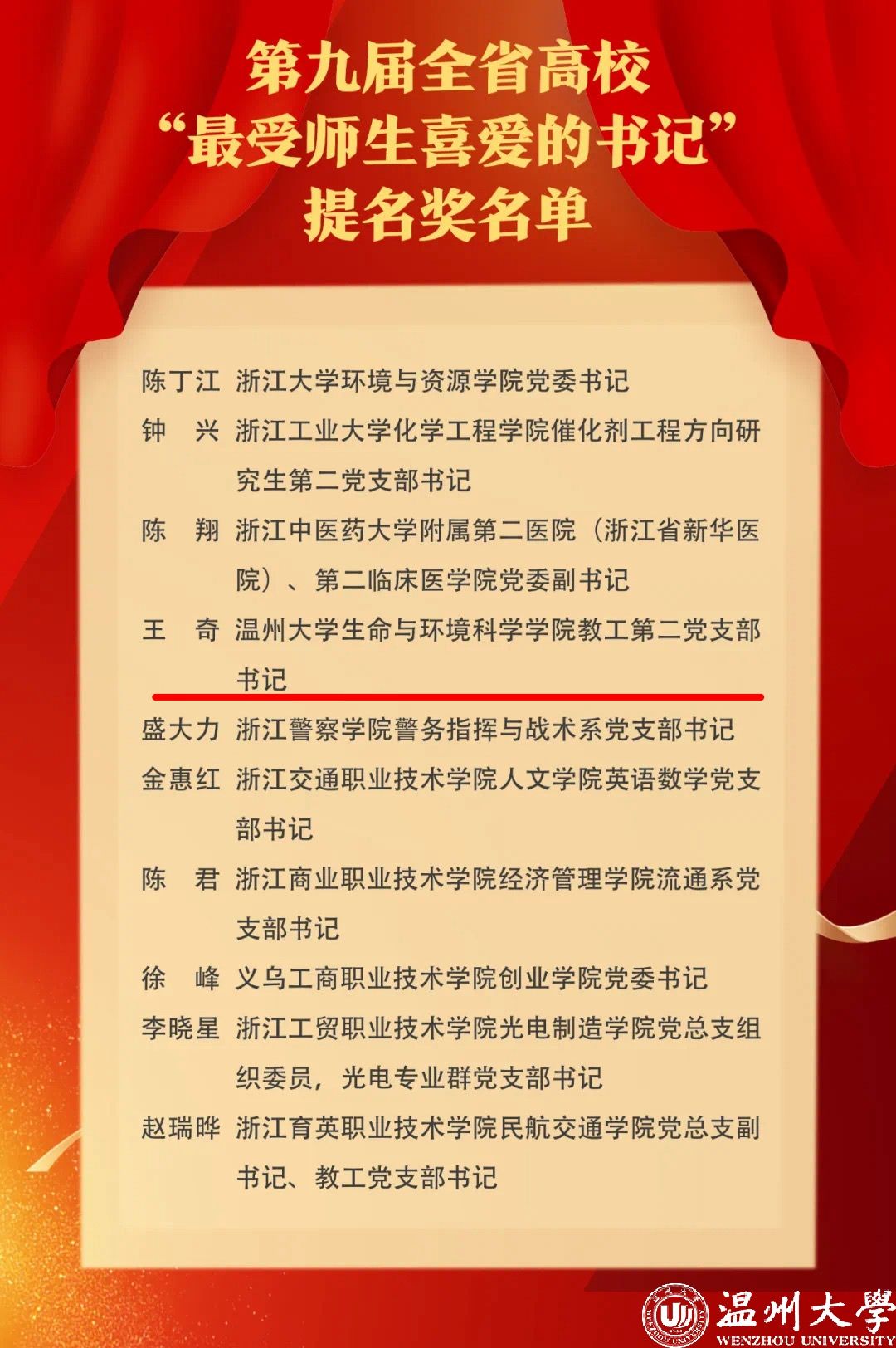 据悉,本次评选活动由浙江省普通高校党建研究专业委员会、浙江教育报刊总社联合组织开展,从全省高校选树一批政治素质好、党建能力强、工作业绩突出、教师学生喜爱的高校基层党组织书记先进典型,共评出“最受师生喜爱的书记”10名和“最受师生喜爱的书记”提名奖10名。