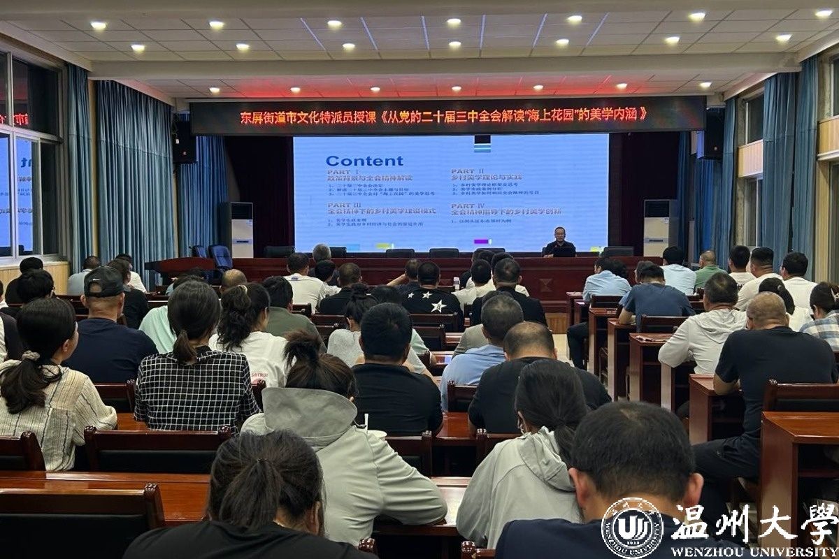 为深入学习贯彻党的二十届三中全会精神,近日,温州市文化特派员日本a片 美术与设计学院副教授郑敬玉在派驻东屏街道开展党的二十届三中全会精神宣讲。