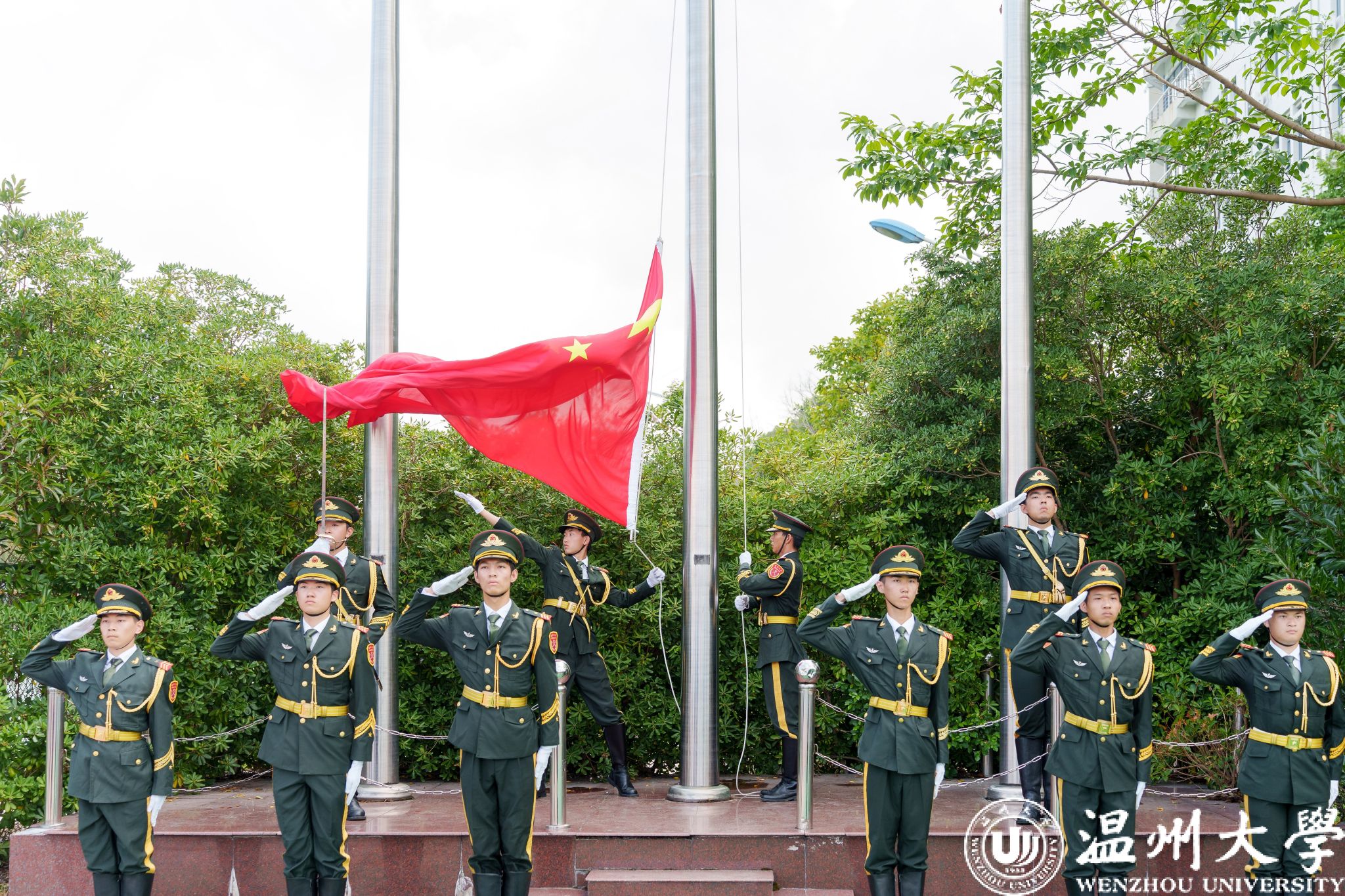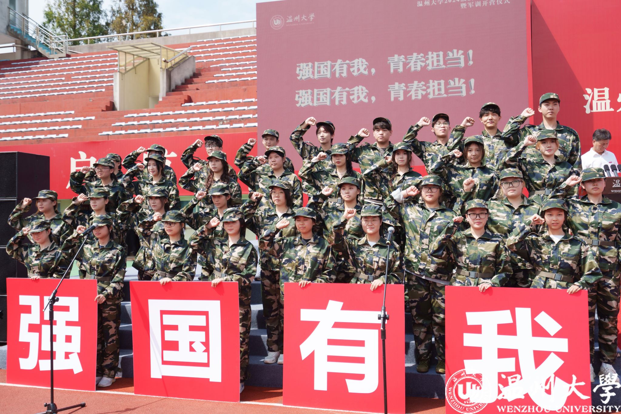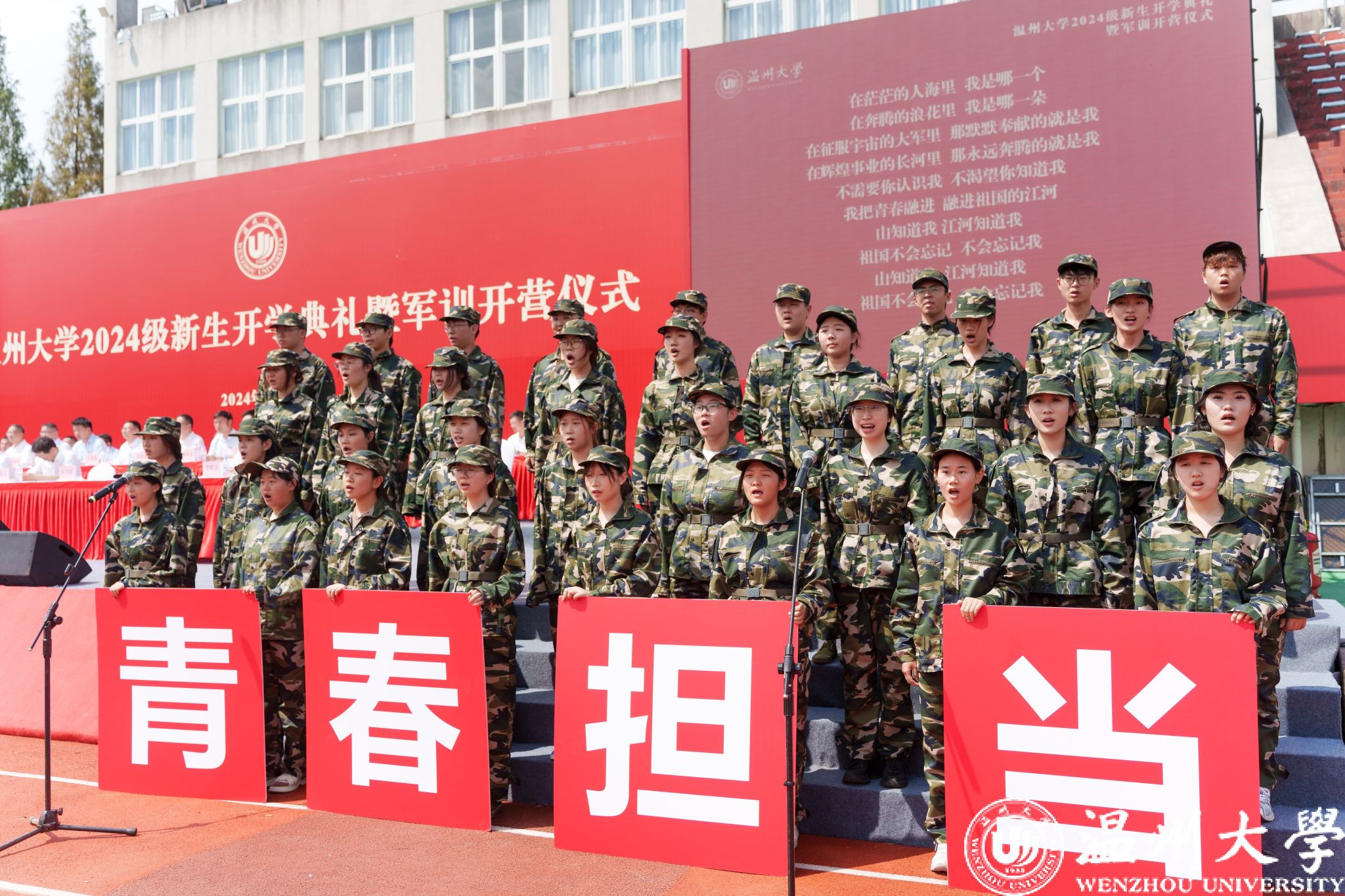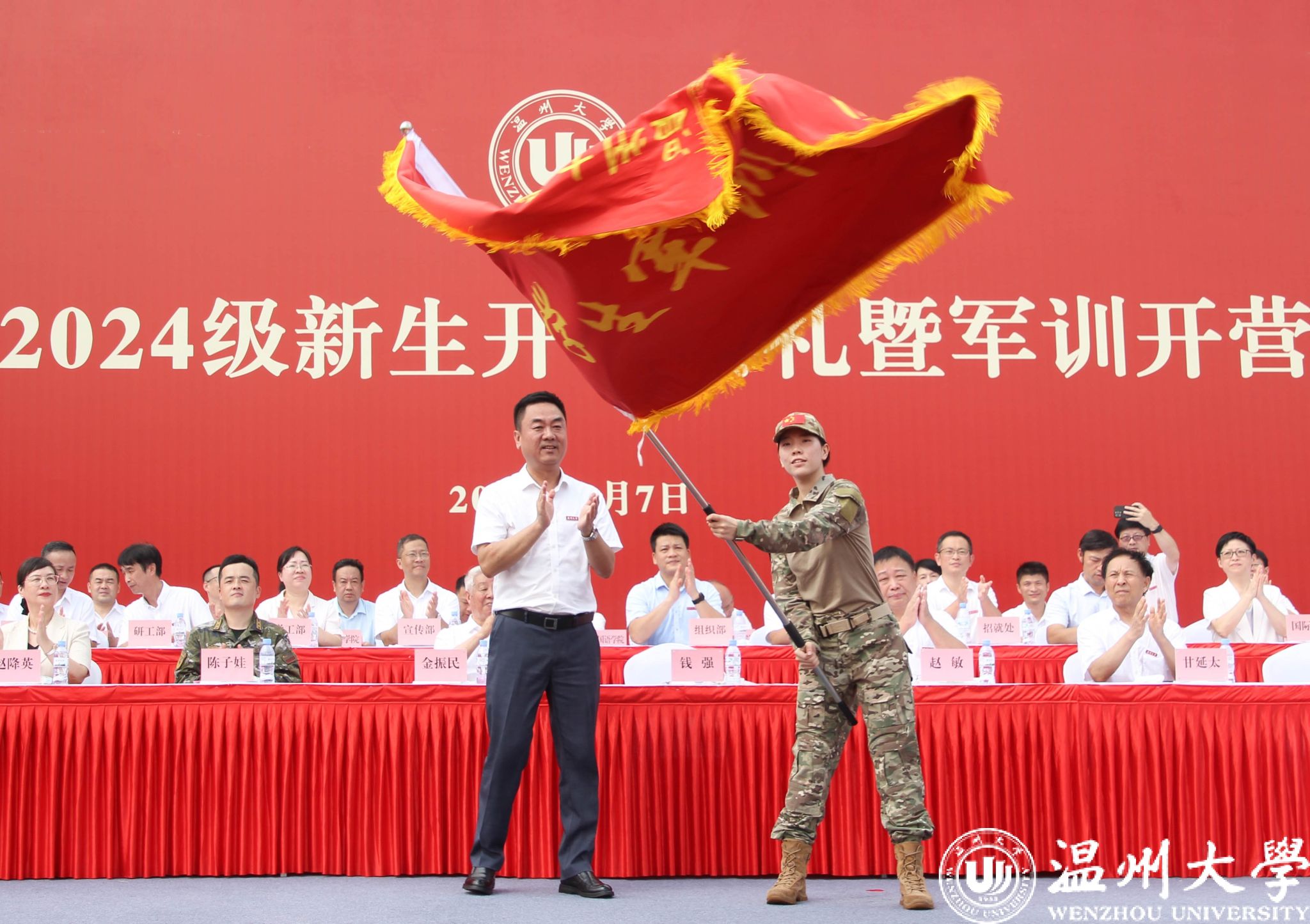 校徽凝结着厚重的温大底蕴,传承着不朽的温大精神。校党委书记钱强、校长赵敏为新生代表佩戴校徽,全体新生一同佩戴校徽。“温大人”成为共同的身份标识,共沐风雨,携手向前。随后,钱强为新生军训团授旗。