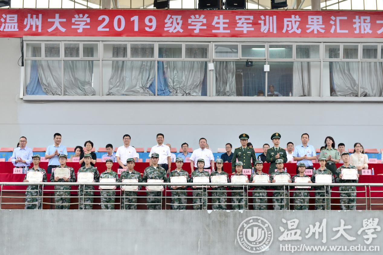 学生工作部相关负责人宣读了军训先进集体和个人的表彰名单,谢树华、庄兴忠等前排就座领导为同学们颁发了荣誉证书。