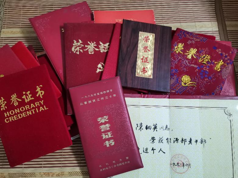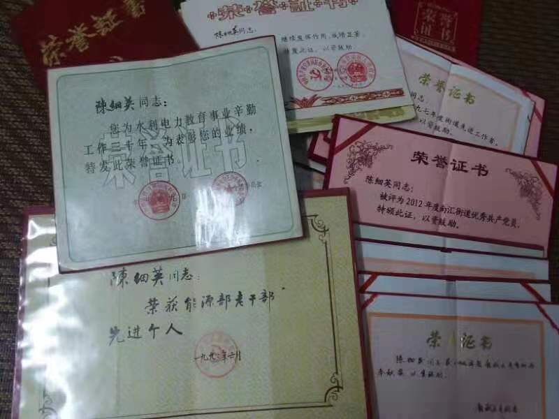 图为陈细英获得的几十本荣誉证书