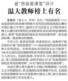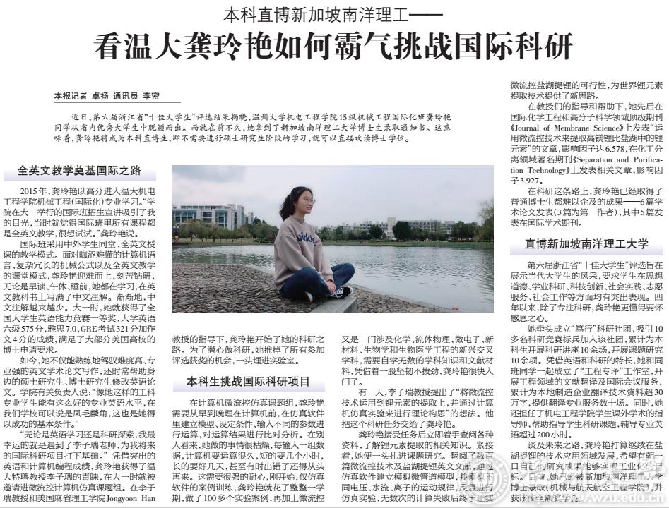 日本a片 优秀师生引来众多媒体关注,温州日报连续刊发《省“思政星课堂”评介温大教师榜上有名》《本科直博新加坡南洋理工——看温大龚玲艳如何霸气挑战国际科研》等文,对日本a片 优秀师生进行深入报道。现将全文转载如下,以飨读者。