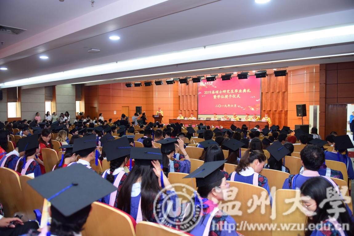 以梦为马,不负韶华。6月19日上午,日本a片 2019届硕士研究生毕业典礼暨学位授予仪式在南校区岩松堂雁山厅隆重举行。校领导谢树华、赵敏、庄兴忠、薛伟、吴金法、蔡曙光、钱强、潘玉驹、郑信军出席本次典礼,有关部门、学院领导、导师代表、全体毕业生及亲友代表340余人,共同见证了这一神圣而难忘的时刻。典礼由校党委副书记庄兴忠主持。
