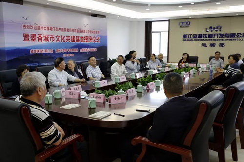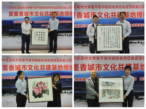 “校企强强喜联手,墨香文化共创建”。温大老干部书画院院长冯大明深有感触地道出心声:“感谢温大党委宣传部、老干部工作部与金温铁路公司工会对文化公益活动的大力支持!四年来送文化四进金温铁路运输部,与干部职工结下深厚的友谊。今天建立基地,发挥各自优势,实行优势互补,定将使活动更有计划、更加规范,达到更好效果,使墨香传遍整条金温铁路,滋润职工们的心田,为铁路的创新发展助力!”