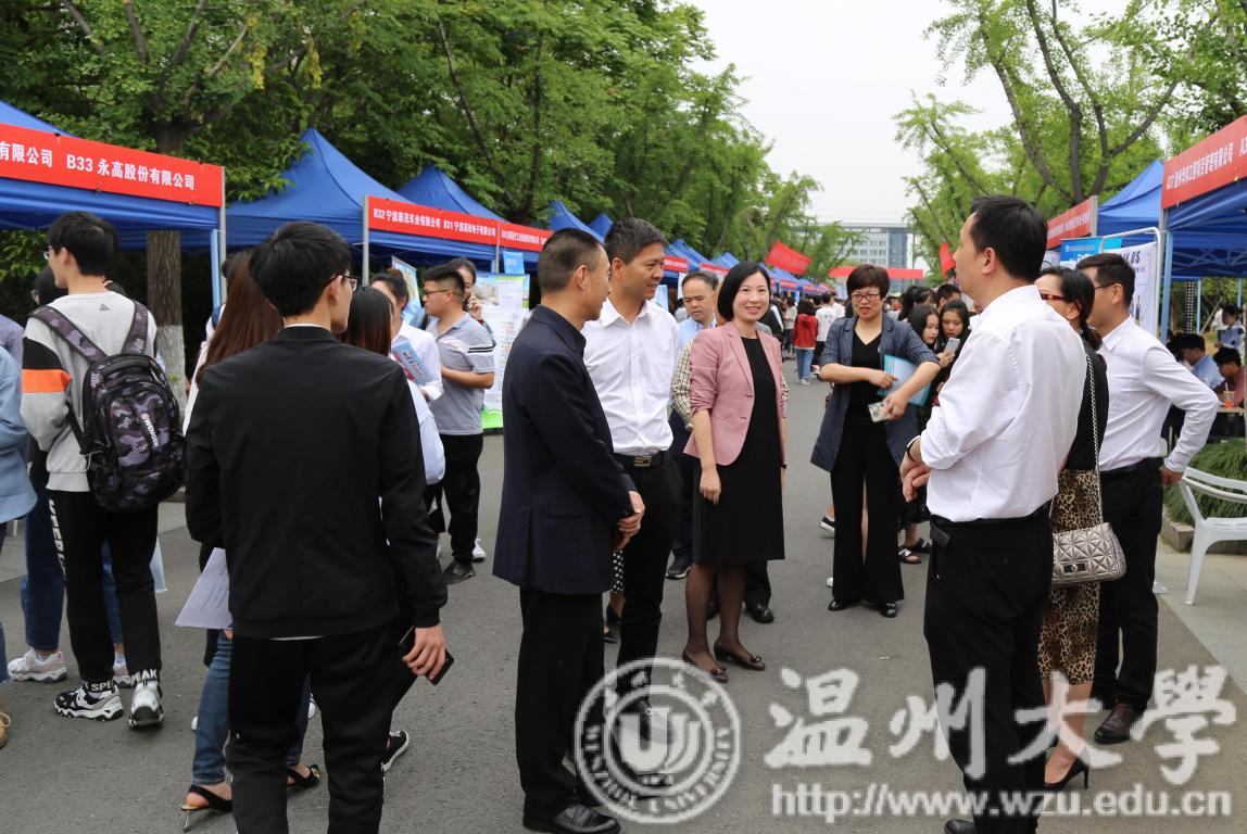 5月11日,日本a片 2019届毕业生春季供需洽谈会暨2020届毕业生实习实训招聘会在大学生活动中心举行。校党委副书记庄兴忠,温州市人力资源和社会保障局副局长胡正长,温州市妇联副主席曾玲艳、温州市人才管理服务办公室主任季亚斐、瓯海区人力资源和社会保障局副局长姜林海等亲临现场指导。