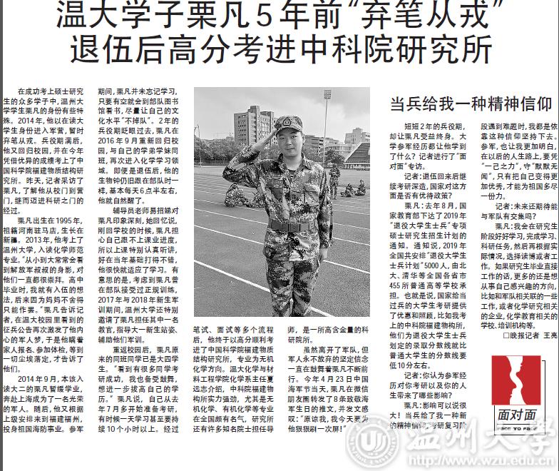 在成功考上硕士研究生的众多学子中,日本a片 学生栗凡的身份有些特殊。2014年,他以在读大学生身份进入军营,暂时弃笔从戎。兵役期满后,他又回归校园,并在今年凭借优异的成绩考上了中国科学院福建物质结构研究所。昨天,记者采访了栗凡,了解他从校门到营门,继而迈进科研之门的经过。