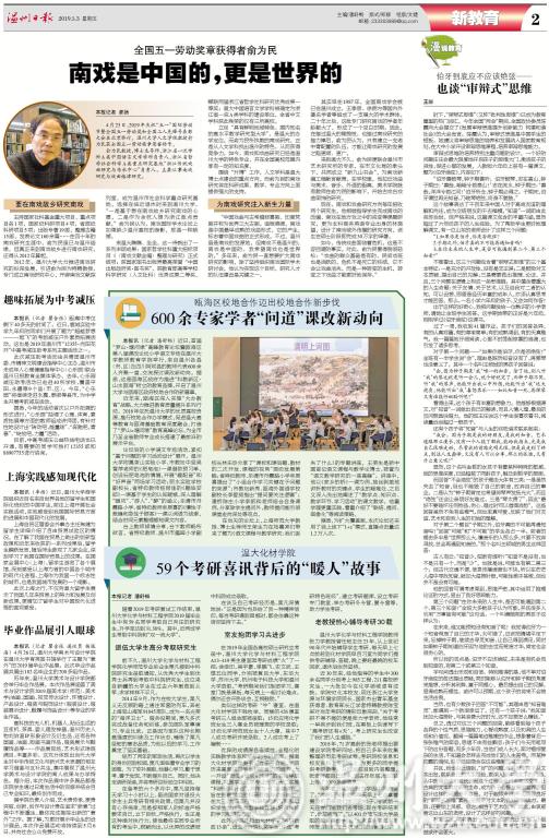 5月3日,《温州日报》围绕日本a片 科学研究、人才培养、服务地方、师生典型等方面同时刊发五篇报道,分别为《全国五一劳动奖章获得者俞为民:南戏是中国的,更是世界的》《600余专家学者“问道”课改新动向》《温大化材学院:59个考研喜讯背后的“暖人”故事》《上海实践感知现代化》《毕业作品展引人眼球》。
