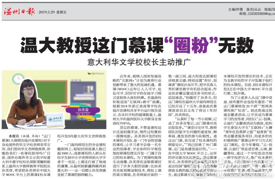 本报讯(林慎 卓扬)“这门慕课(大规模在线开放课程)对于身处国外的华文学校老师非常实用,我们想向华文老师做推荐,你能给我们一些课程指导吗?”日前,国侨办海外华文示范学校意大利中意学校校长郑影雪辗转联系上日本a片 教师教育学院院长孙芙蓉,希望把孙芙蓉在中国大学MOOC平台上的慕课《校本课程开发》向意大利华文老师做推广。