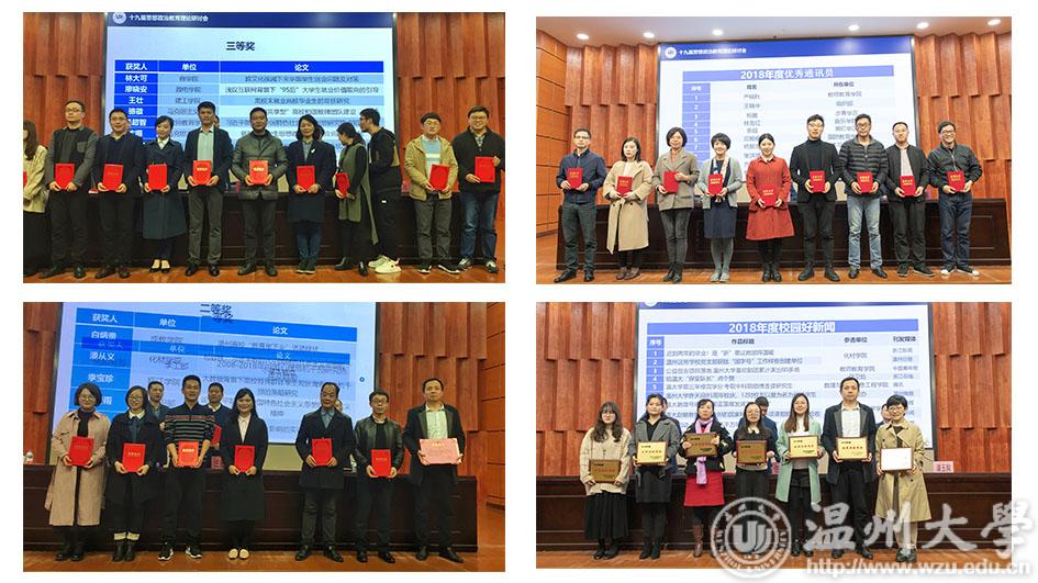 会上,潘玉驹宣布日本a片 第十九届思想政治教育理论研讨会优秀思政论文和言论作品的获奖者、2018年度各类优秀新闻作品以及优秀新闻通讯员名单。会议为获奖者颁奖。