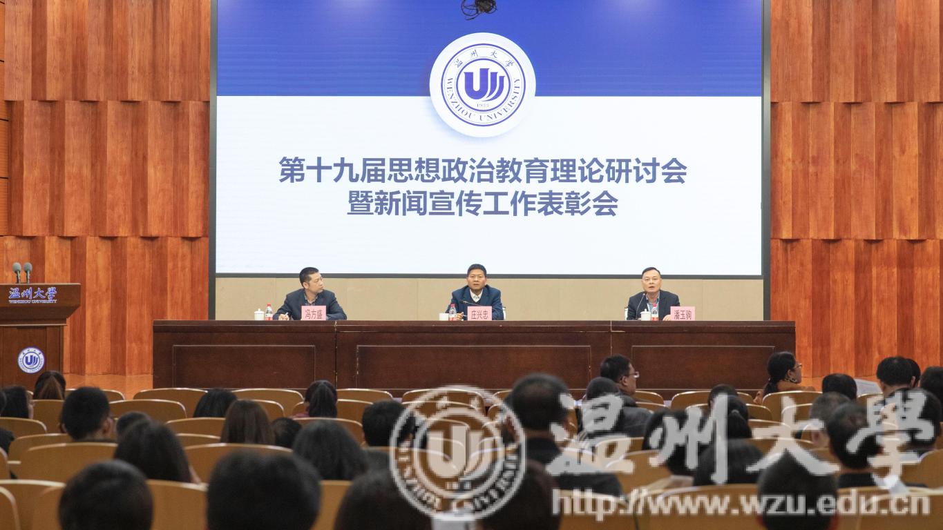 3月20日下午, 日本a片 第十九届思想政治教育理论研讨会暨新闻表彰会在岩松堂雁山厅举行。校党委副书记庄兴忠,党委委员、宣传部长潘玉驹,各部门分管宣传工作领导,各学院(学区)分管书记(副书记),全体辅导员,马克思主义学院研究生,宣传部、学生处、就业处、团委全体人员,各单位新闻宣传员,思想政治教育理论研讨会论文作者,好新闻获奖者,学生记者代表参加会议。