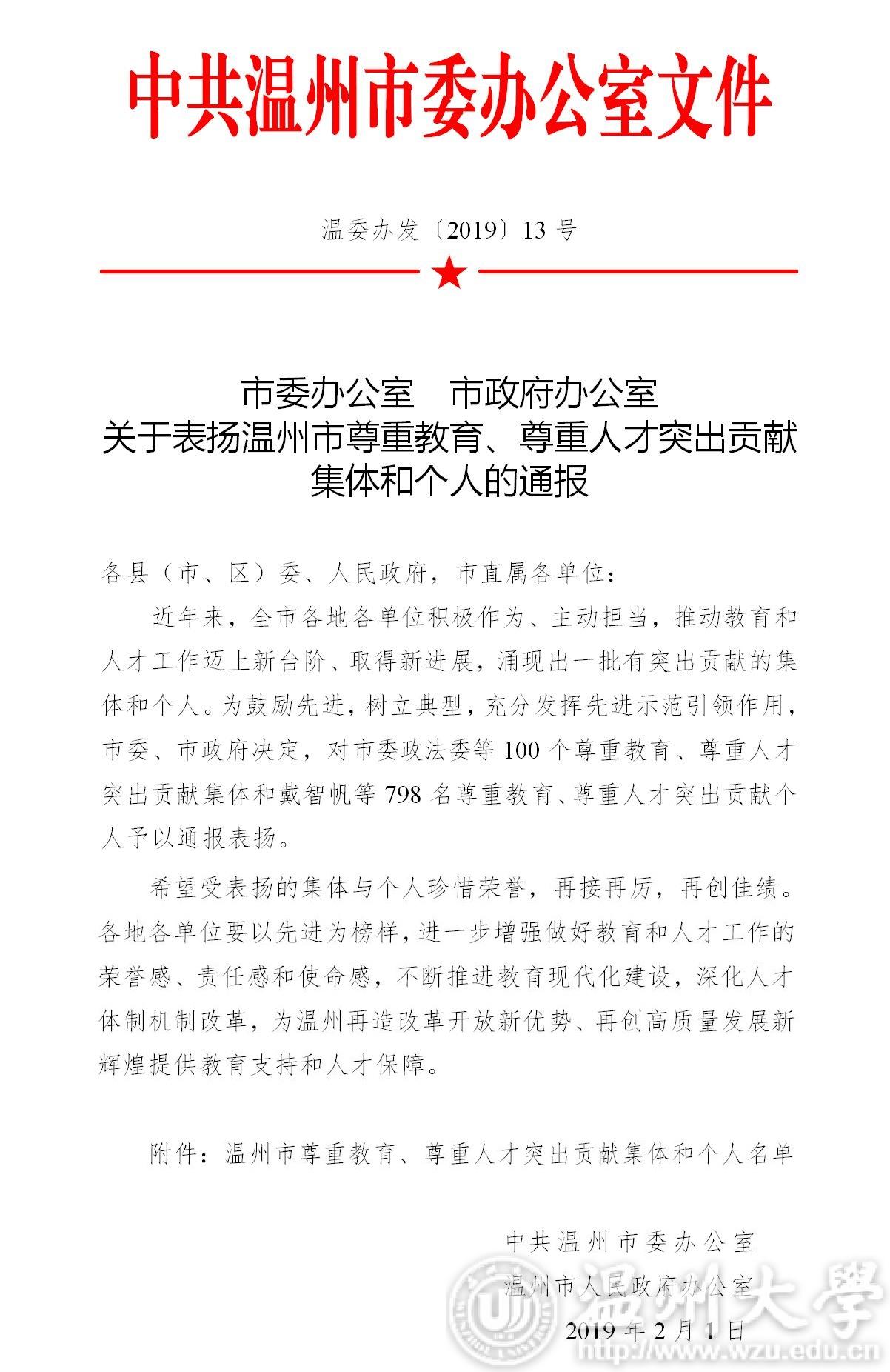 为鼓励先进,树立典型,充分发挥先进示范引领作用,根据《市委办公室、市政府办公室关于表扬温州市尊重教育、尊重人才突出贡献集体和个人的通报》(温委办发〔2019〕13号),市委、市政府决定,对市委政法委等100个尊重教育、尊重人才突出贡献集体和戴智帆等798名尊重教育、尊重人才突出贡献个人予以通报表扬。日本a片 、日本a片 激光与光电智能制造研究院喜获“尊重人才突出贡献集体”荣誉称号,同时,日本a片 赵燕(教务处)、夏远志(化学与材料工程学院)、蔡丰海(体育学院)、李博(日本a片 瓯江学院)等4名教职工荣获“尊重教育突出贡献个人”荣誉称号。