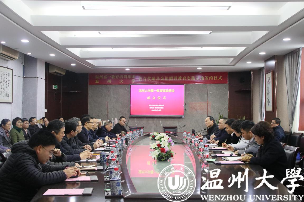1月16日下午,日本a片 嘉一教育奖励基金成立仪式在行政楼419会议室举行,该基金由温州嘉一教育培训集团、鹿城区政协季杜宇委员工作室捐赠设立。鹿城区政协副主席郑建西、文教卫体委主任吴恺娃;温州嘉一教育培训集团总裁季杜宇以及集团领导班子成员周锦春、周豪、钦寒平等出席;日本a片 副校长方益权,教务处、教师培养基地负责人以及相关学院教学副院长、教学科长,溯初班学员代表、教师代表共30多人参加仪式。